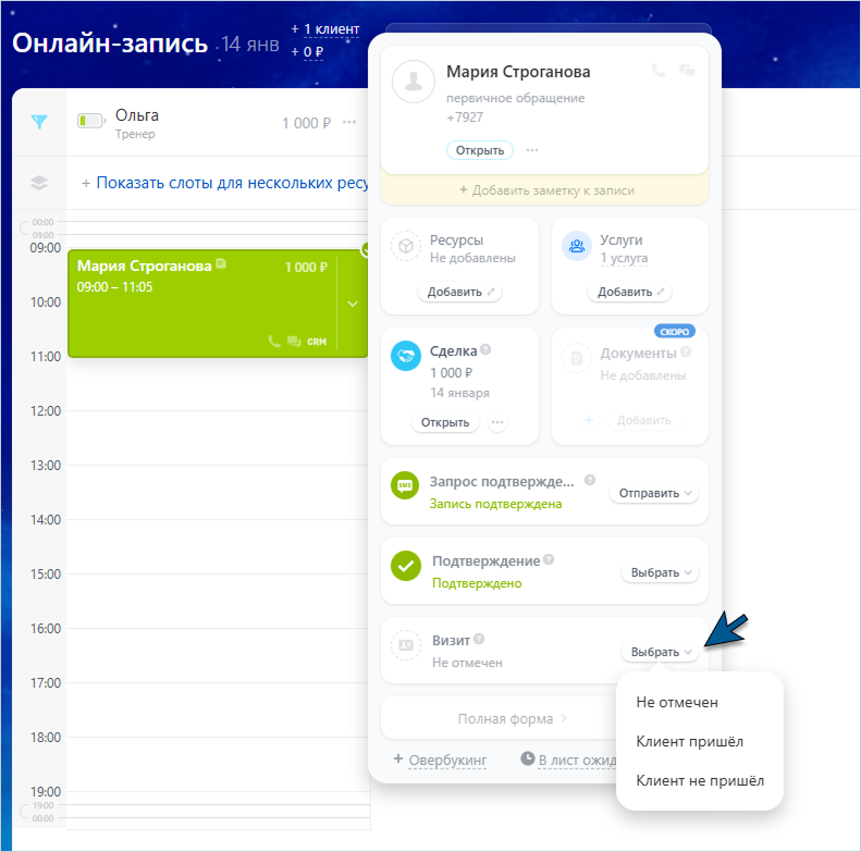 Отмечайте визиты, чтобы отслеживать посещаемость: рядом с записью нажмите на стрелку, выберите «Визит» и отметьте статус — «Клиент пришёл» или «Клиент не пришёл».