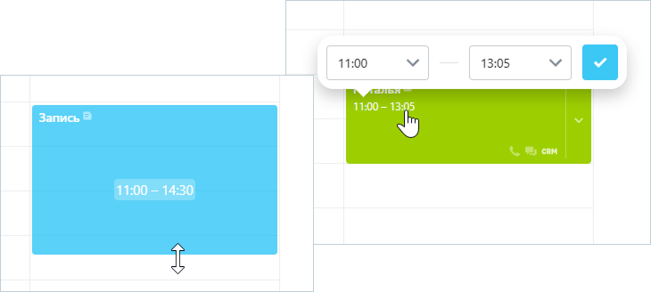 Растяните границу записи или кликните на временной промежуток записи, чтобы изменить продолжительность.