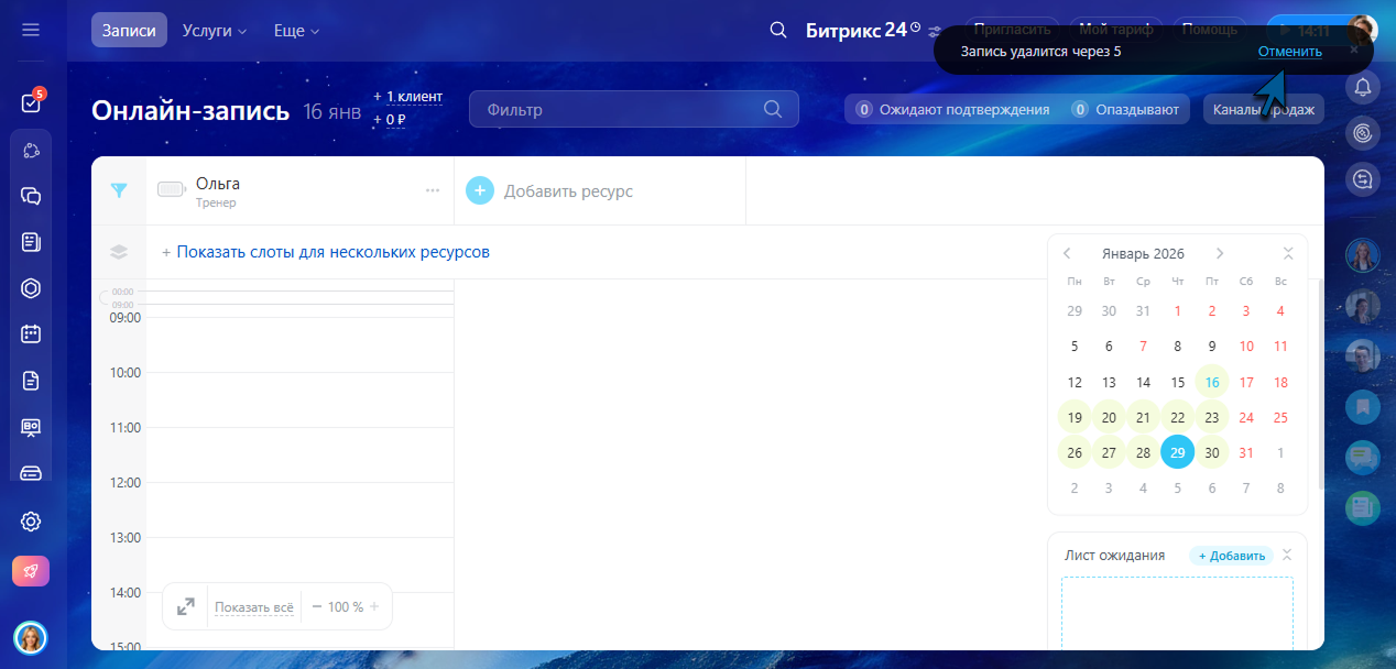 Чтобы открыть расписание, выберите пункт «Онлайн-запись» в меню. Здесь отображаются все ресурсы и записи.