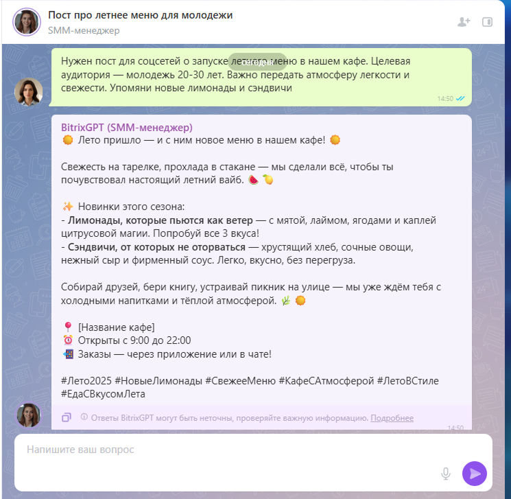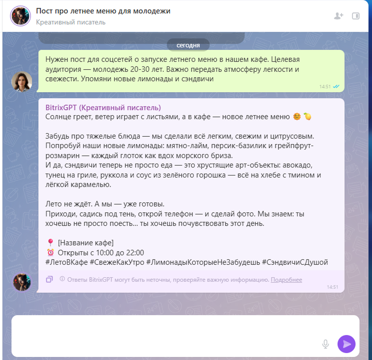 «Нужен пост для соцсетей о запуске летнего меню в нашем кафе. Целевая аудитория — молодежь 20-30 лет. Важно передать атмосферу легкости и свежести. Упомяни новые лимонады и сэндвичи». -
