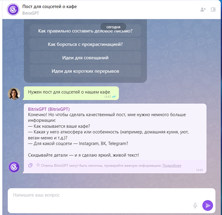 BitrixGPT умеет размышлять, если данных в вашем запросе недостаточно, он задаст уточняющие вопросы. А если ответ не идеален с первого раза, просто попросите: «Перепиши короче, максимум 500 символом», «Сделай тон мягче», «Добавь больше примеров».