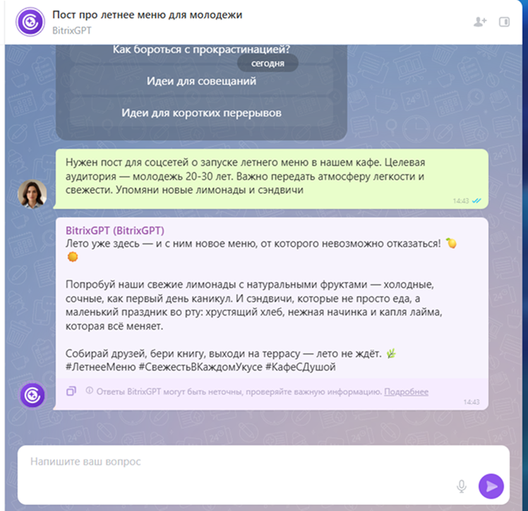 Написать убедительный текст вакансии, придумать вирусный пост для соцсетей или продумать концепцию рекламной кампании. Всё это — в чате с BitrixGPT, вашим персональным экспертом на все случаи.