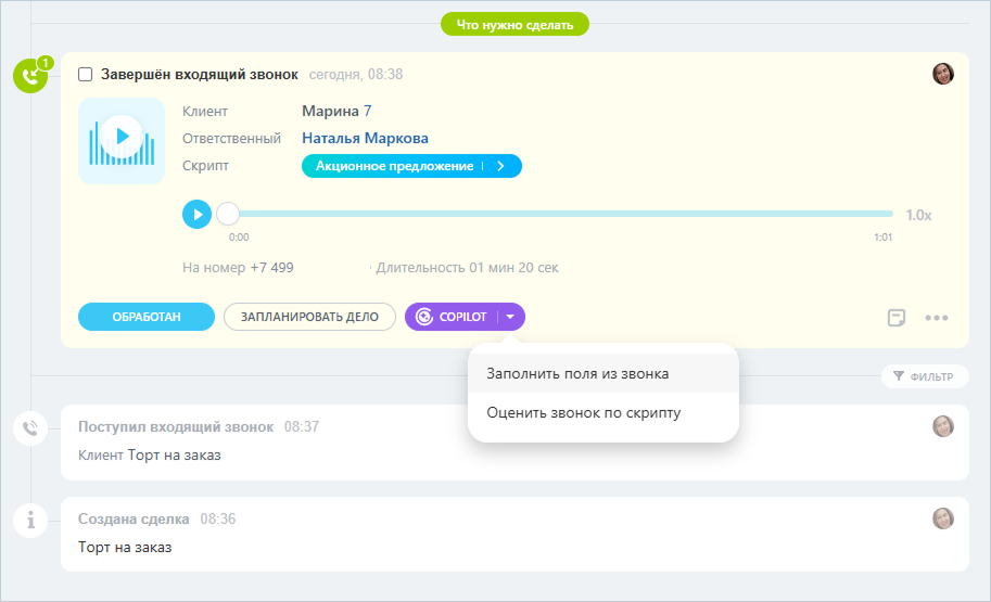 - CoPilot в CRM: расшифровка звонков и заполнение карточки