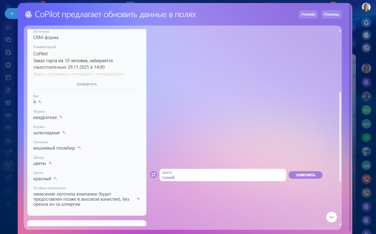 Клиент заказывает торт на мероприятие. В диалоге обсуждают вес, вкус, оформление. После обработки звонка автоматически заполняются соответствующие поля в CRM.