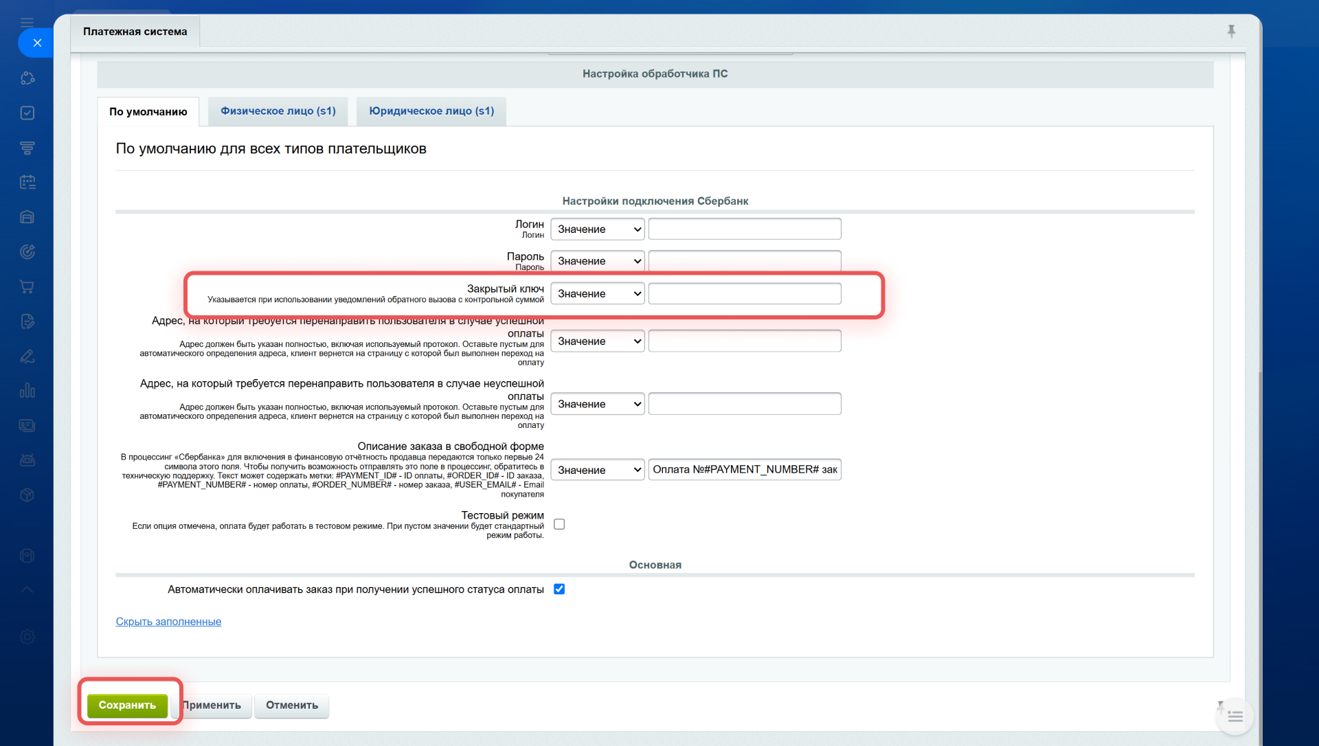 Сгенерированный callback-токен укажите в настройках платежной системы в поле Закрытый ключ.