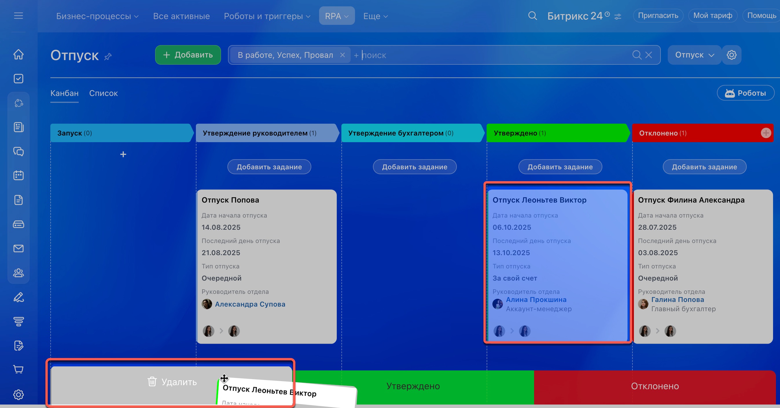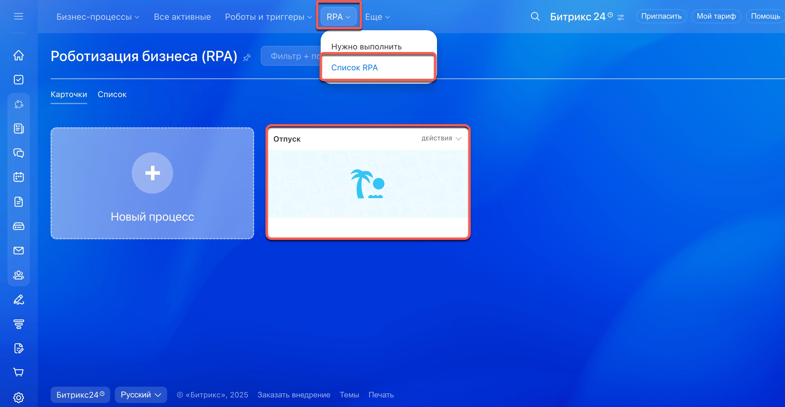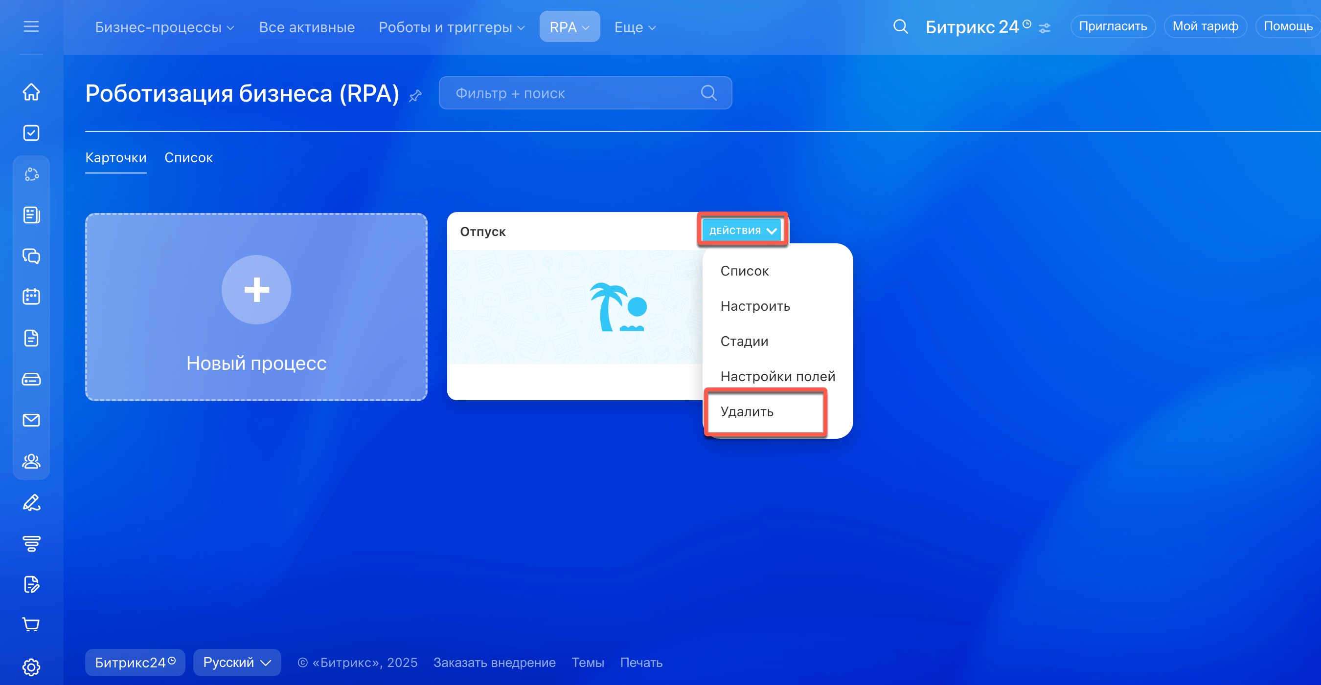 Если в процессе не осталось заданий, перейдите во вкладку Роботизация бизнеса и удалите его.