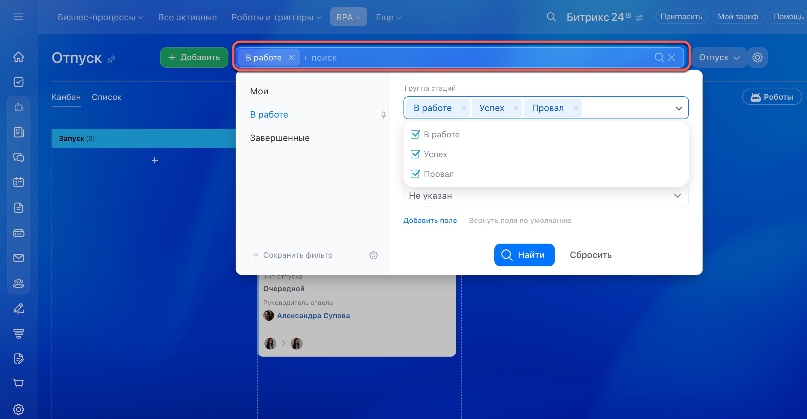 В фильтре выберите все группы стадий - Успех, Провал и В работе. В этом случае вы увидите все задания в бизнес-процессе.