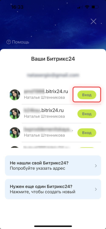 Если у вас несколько Битрикс24, здесь можно выбрать, в какой из аккаунтов вы хотите войти.