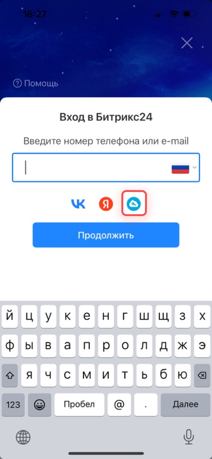 Номер телефона. Для входа введите номер телефона и Битрикс24 пришлет СМС с кодом, который нужно ввести.