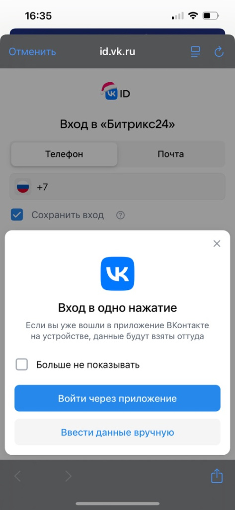 ВКонтакте, Яндекс. Нажмите на иконку сервиса, который связан с вашей учетной записью Битрикс24. Разрешите приложению доступ к учетной записи.