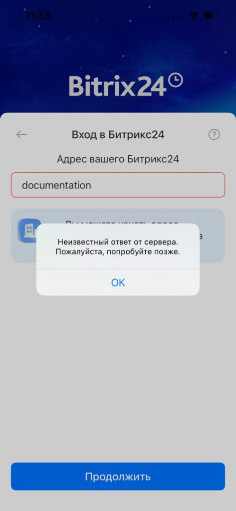 Ошибка. После ввода адреса вашего Битрикс24 появляется ошибка «Неизвестный ответ от сервера. Пожалуйста, попробуйте позже.»