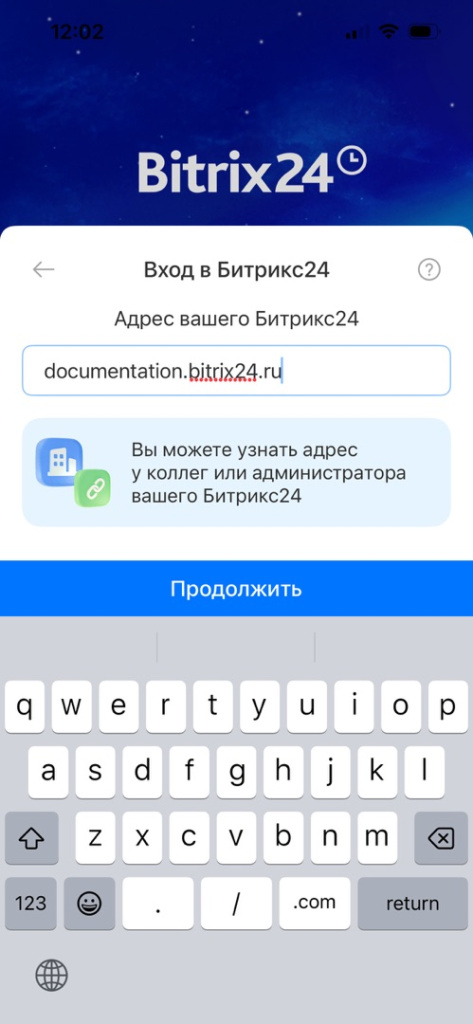 Введите полный адрес, например: mycompany.bitrix24.ru.