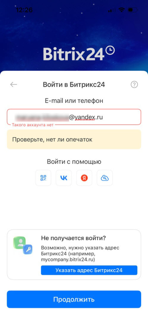 Причина. Сообщение появляется, если Битрикс24 не находит аккаунт по указанному логину. Например, если введен неверный e-mail или номер телефона, либо нужно использовать другой способ входа — по адресу или через социальные сети.