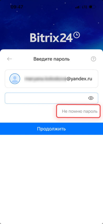 Решение. Если вы забыли пароль, нажмите Не помню пароль на странице входа. Битрикс24 пришлет письмо на e-mail, указанный при регистрации. Введите код из письма. После этого вы автоматически войдете в Битрикс24.