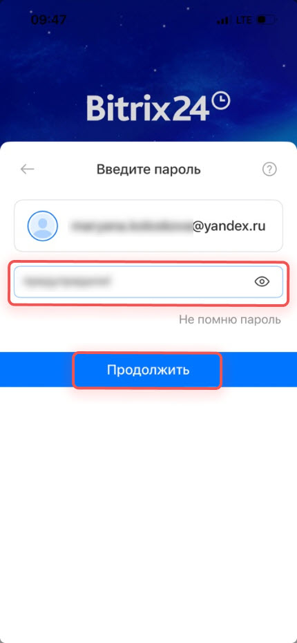 Введите пароль и нажмите Продолжить. После этого вы войдете в Битрикс24.