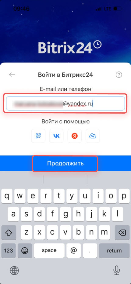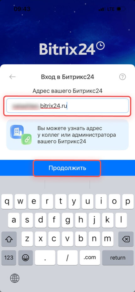 Введите адрес вашего Битрикс24, например, mycompany.bitrix24.ru или crm.mycompany.ru. Нажмите Продолжить.