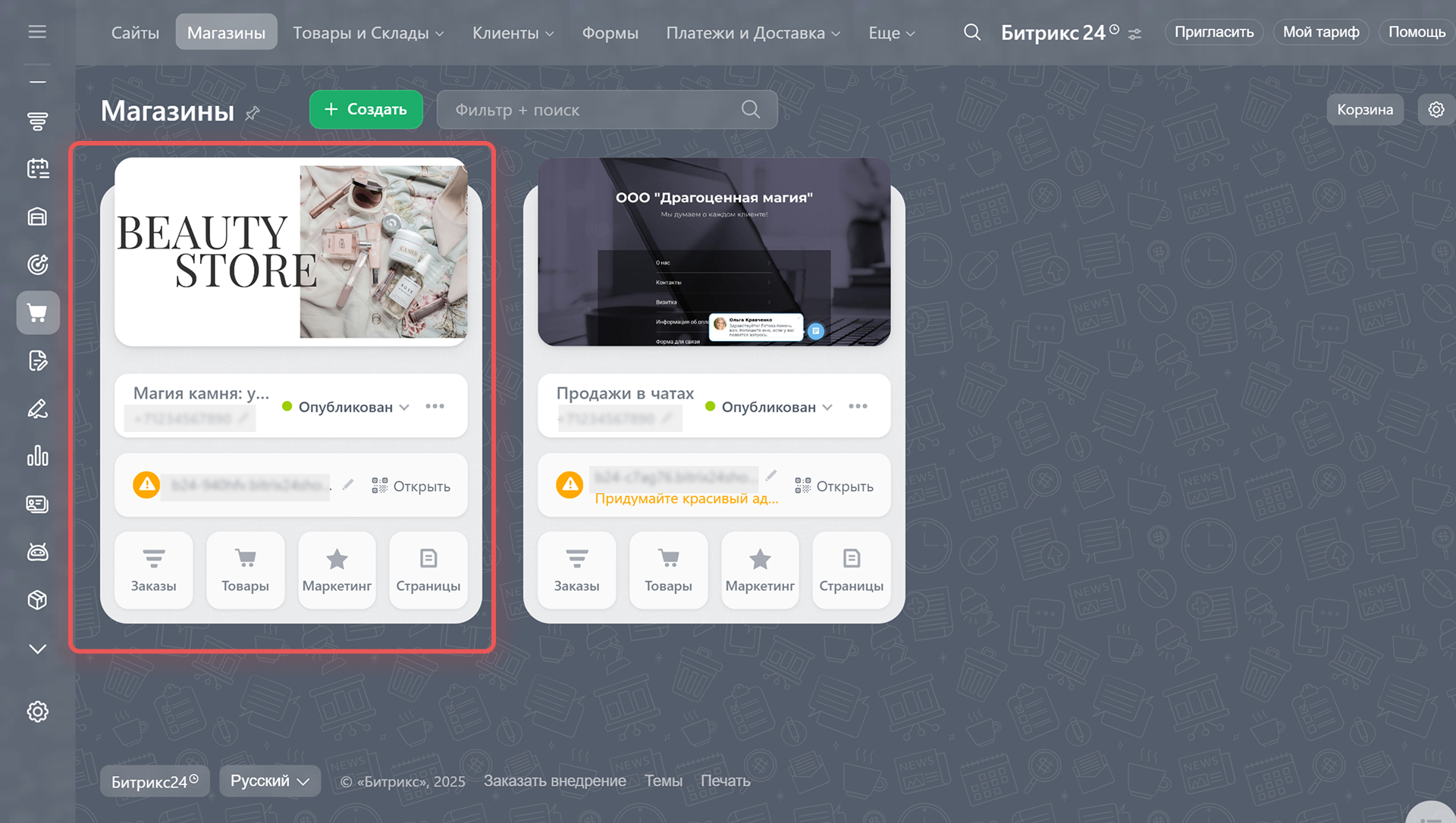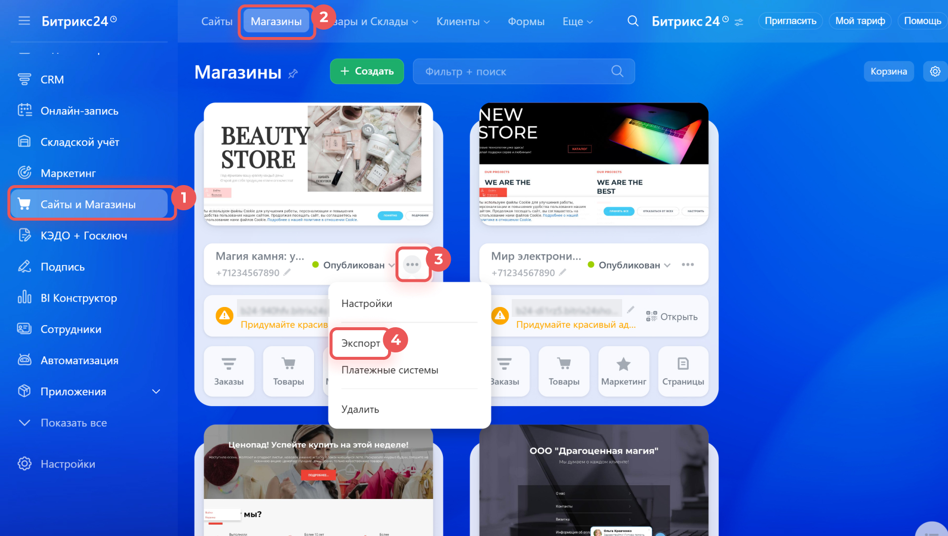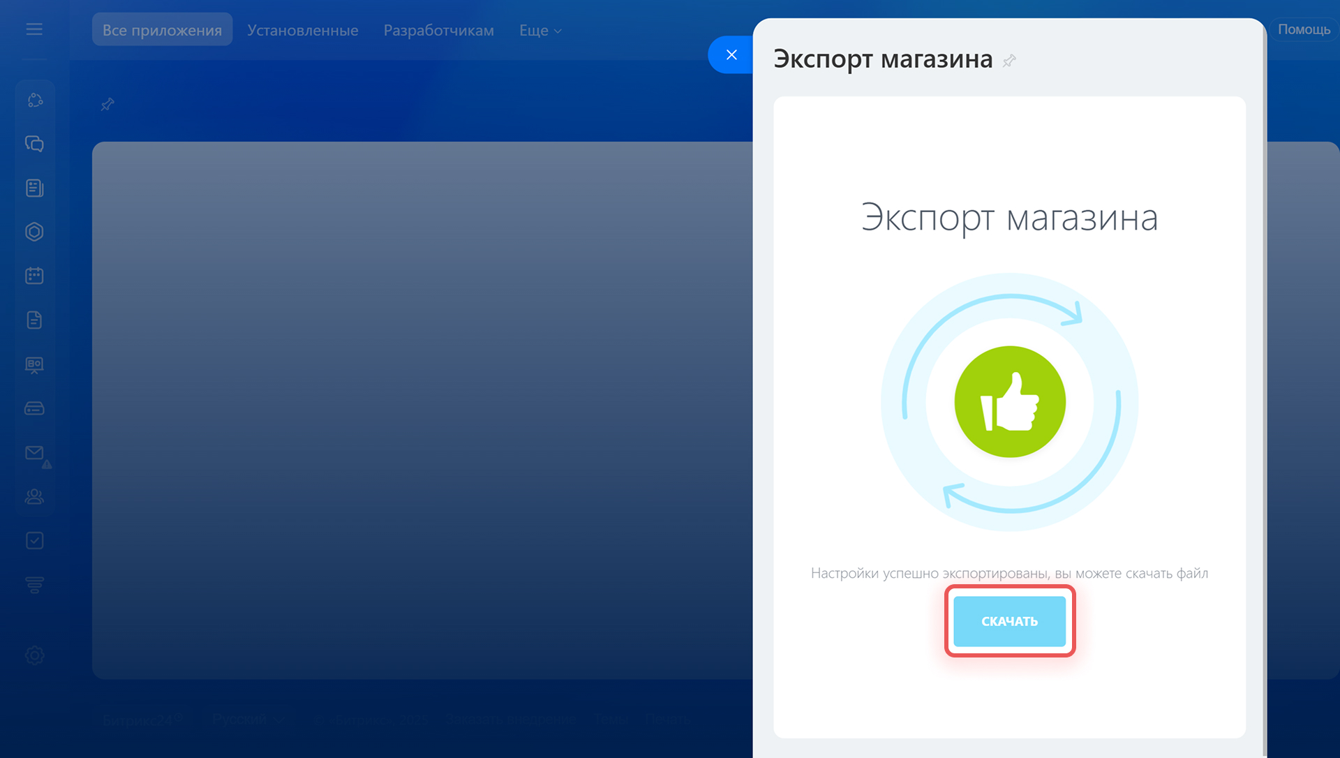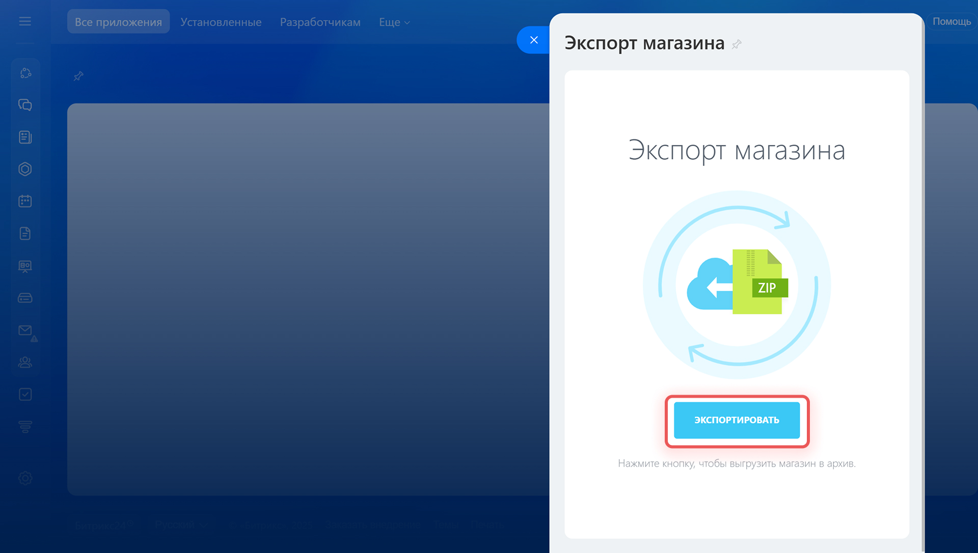 - Экспорт магазина доступен только на коммерческих тарифах Битрикс24.