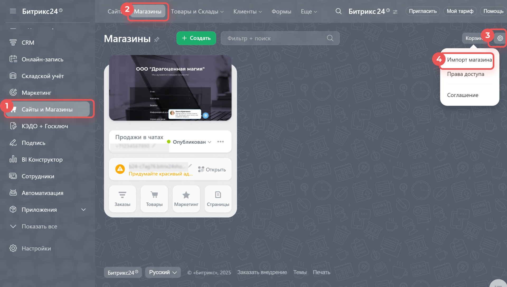 В другом Битрикс24 перейти в раздел Магазин, далее во вкладку Магазины и выбрать в шестеренке Импорт магазина: