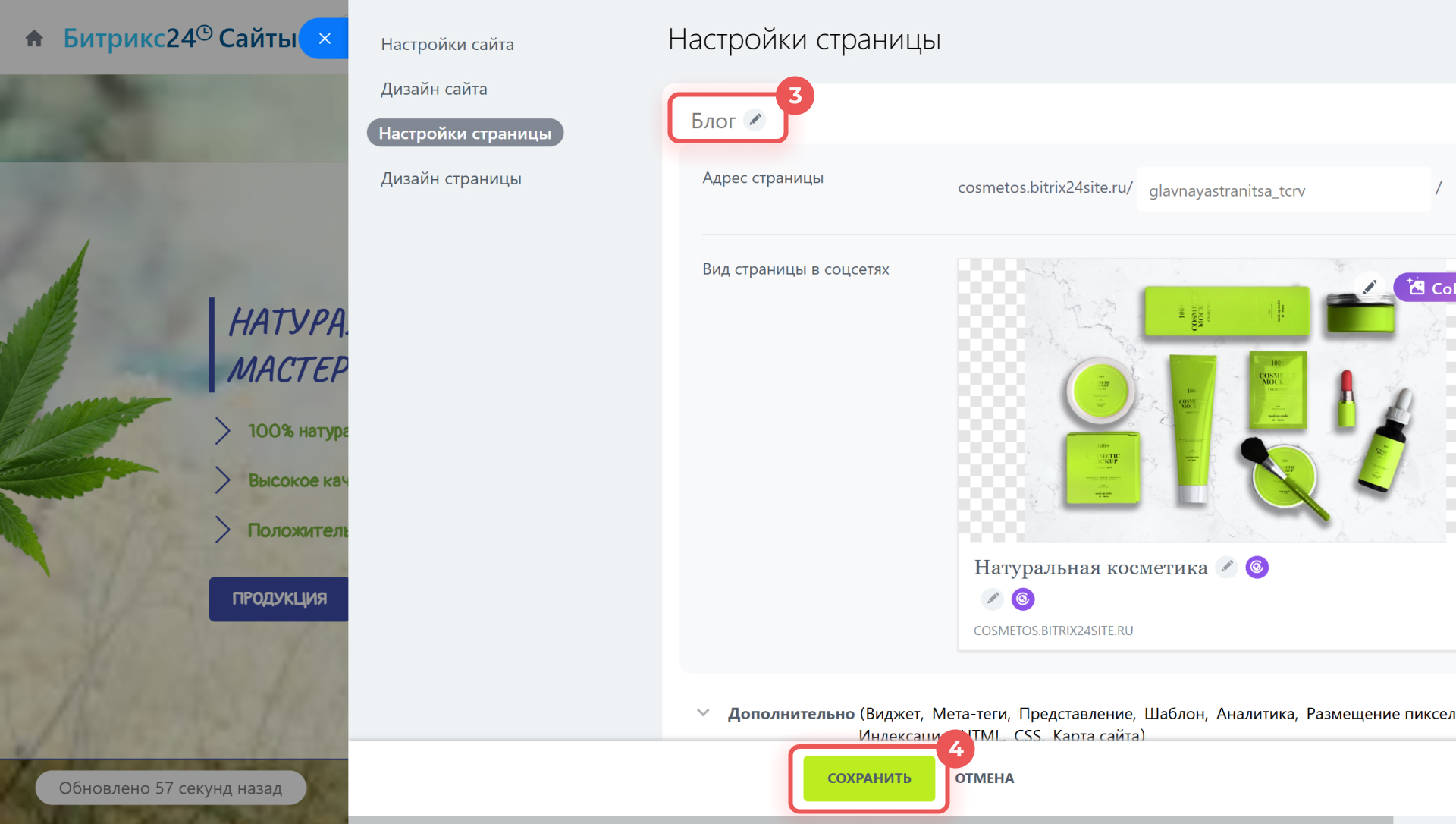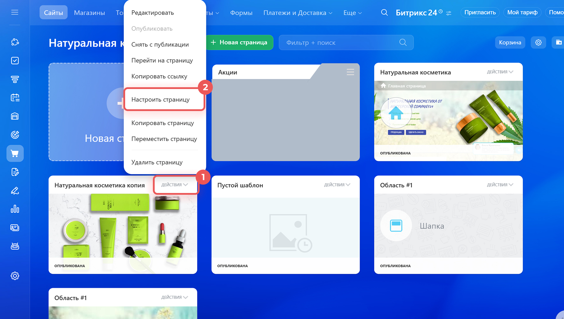 Откройте список страниц сайта. Выберите нужную и нажмите Действия - Настроить.