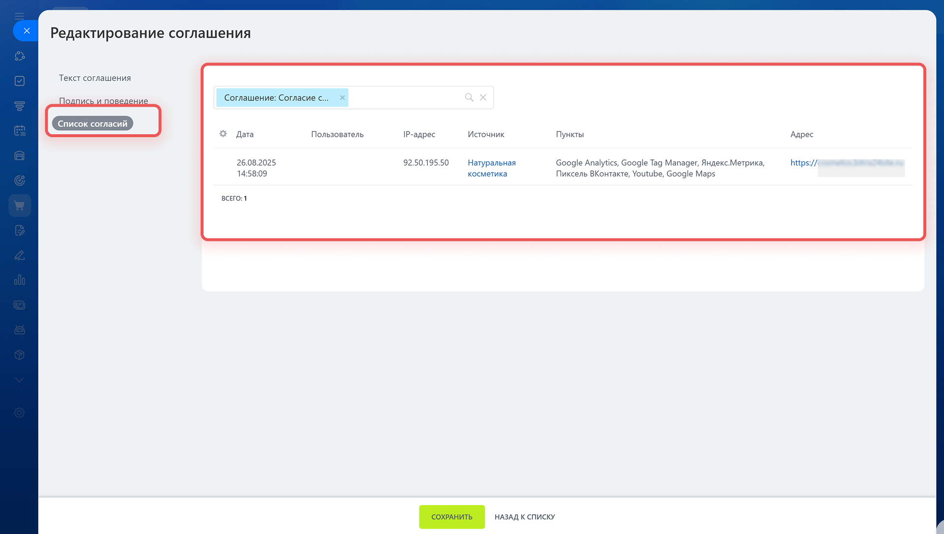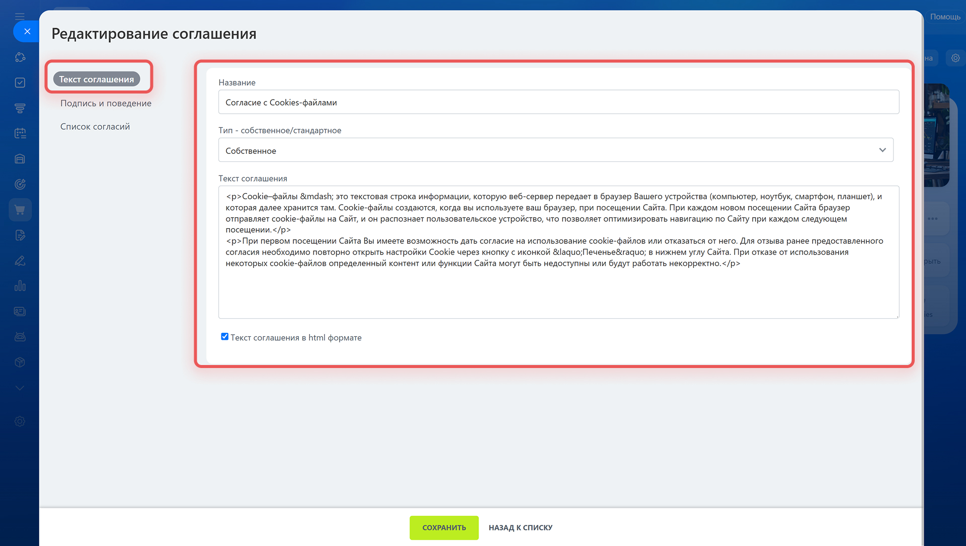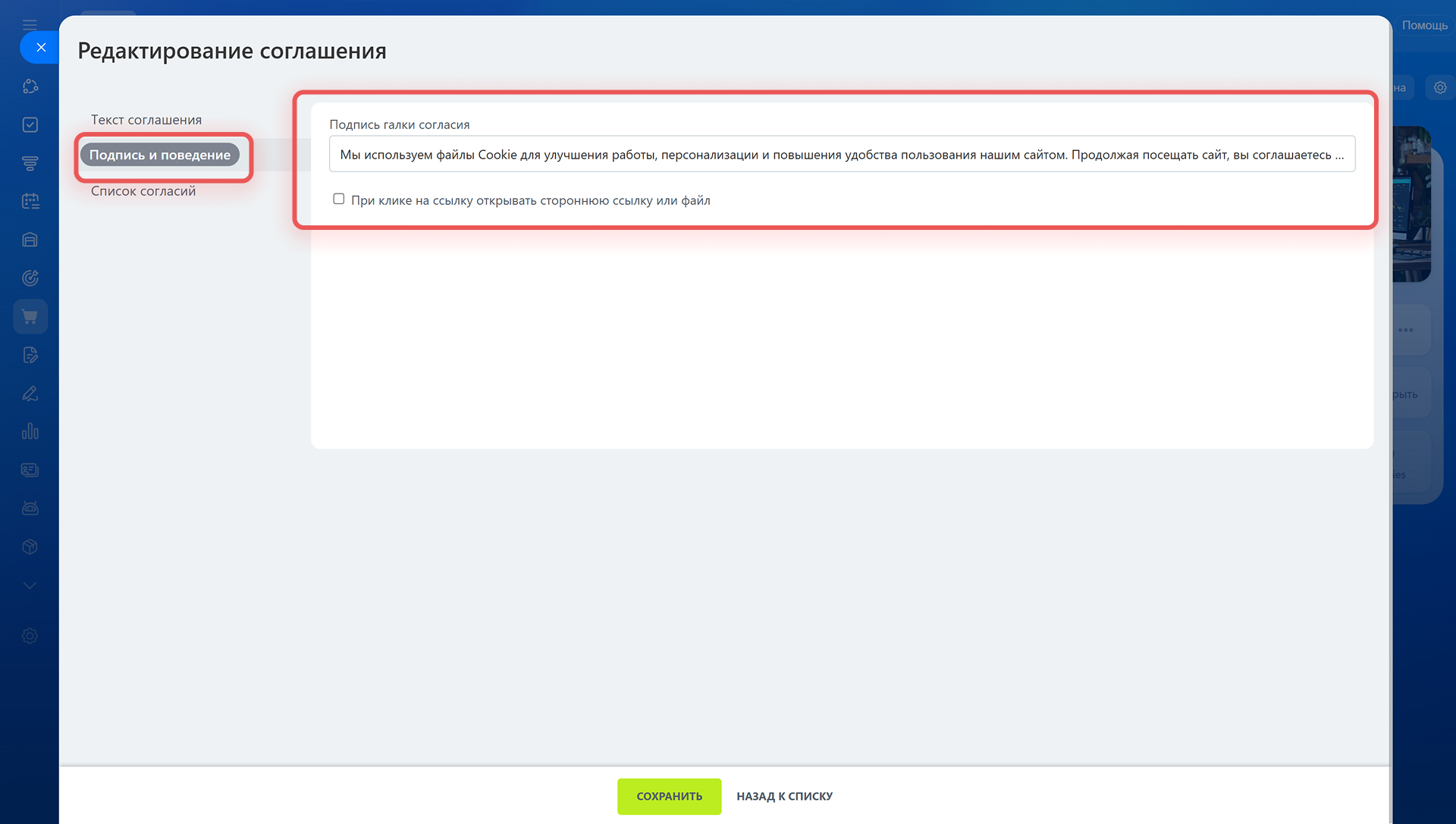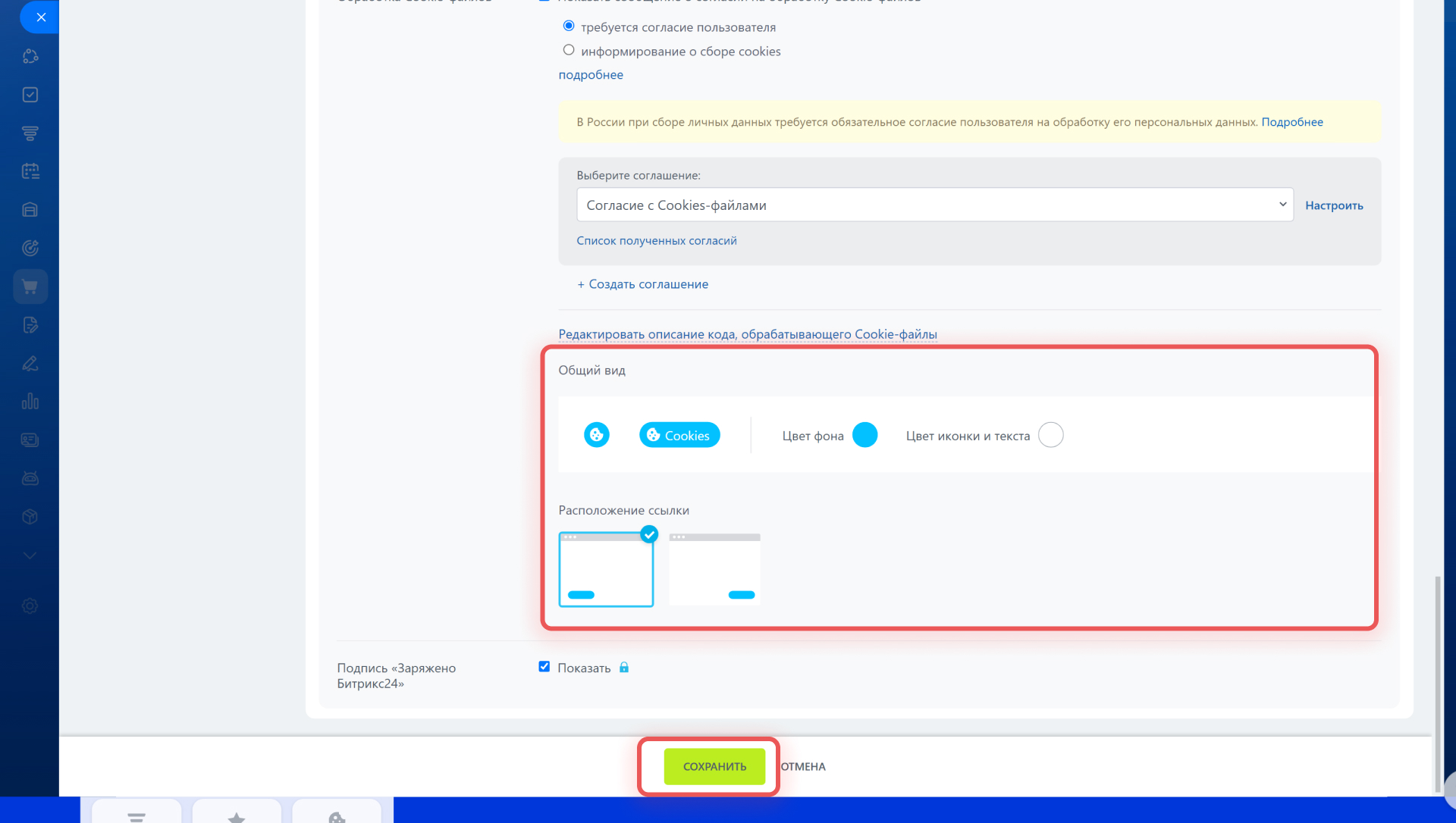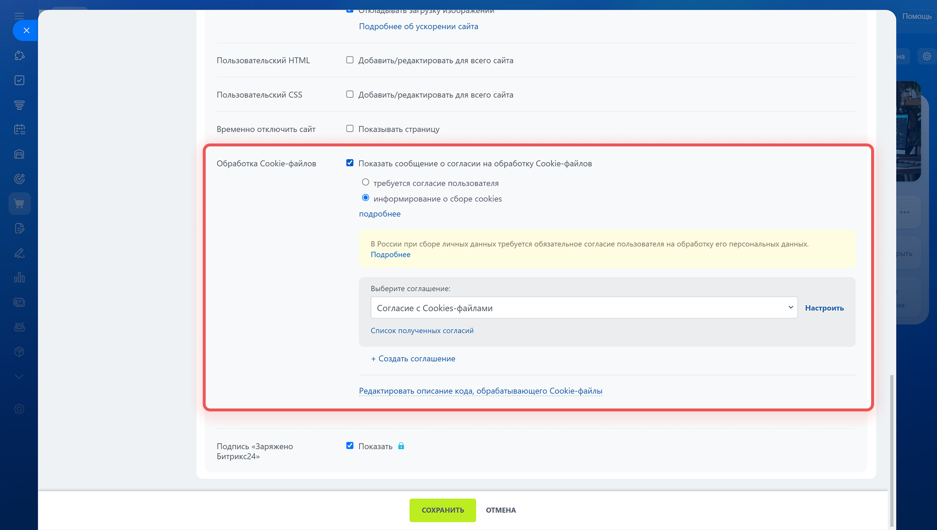 Как включить соглашение на обработку cookie-файлов