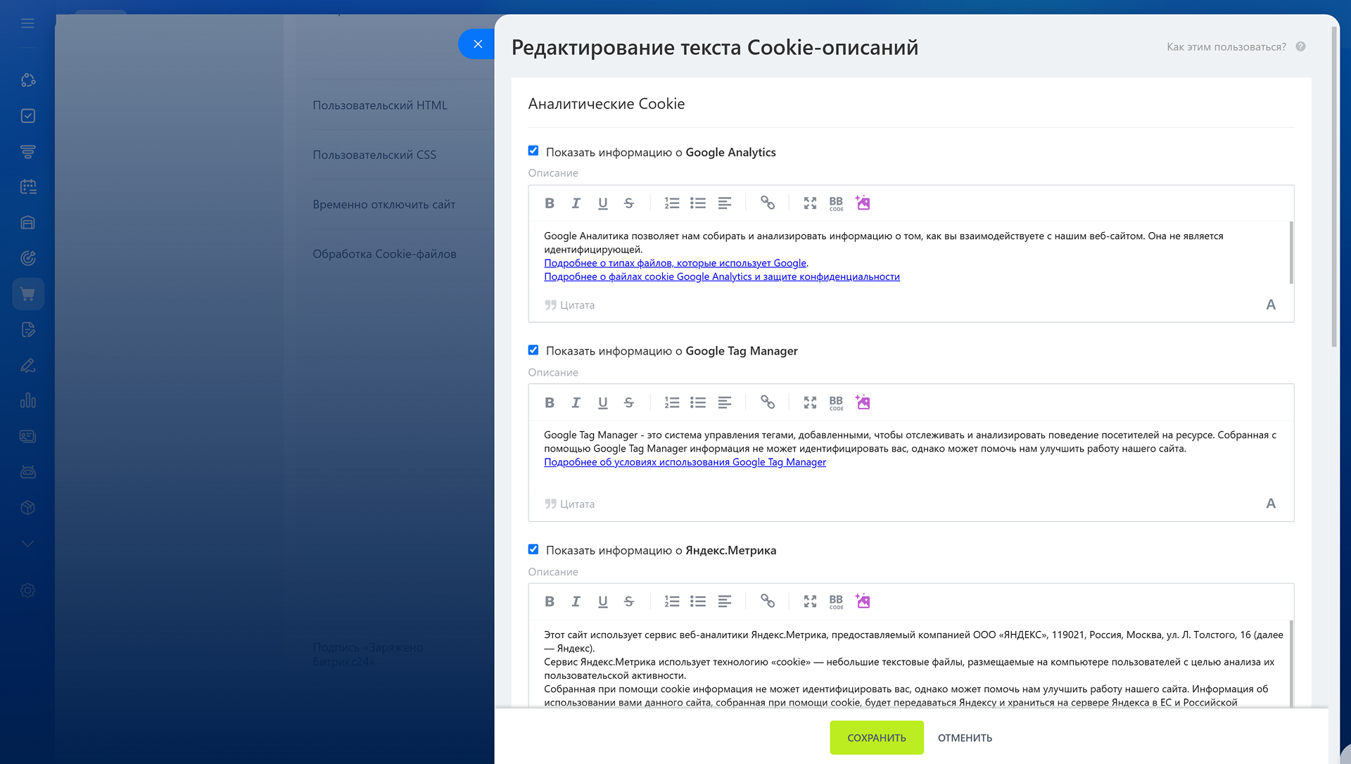 Вы можете редактировать эти тексты, а также скрывать описание сервисов для вашего сайта, cookie-файлы которых вы не сохраняете у посетителей: