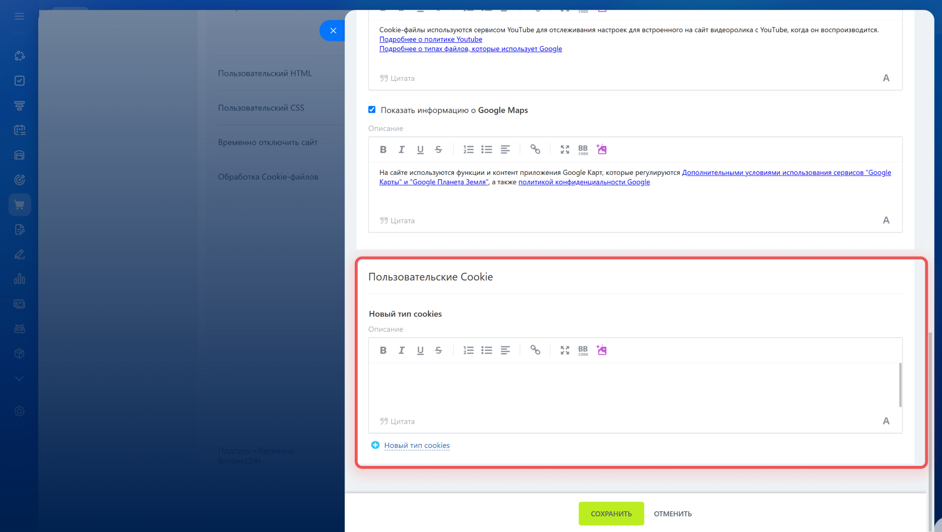 Если у вас к сайту подключен другой сервис, и он использует файлы cookie, то обязательно добавьте описание этого сервиса: