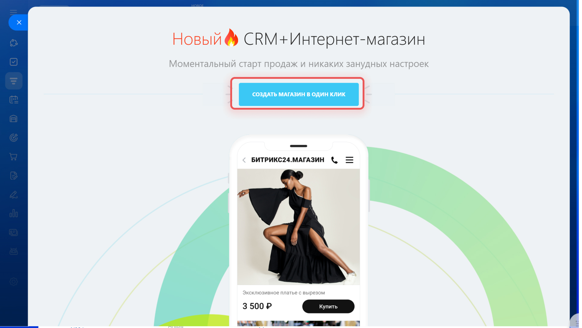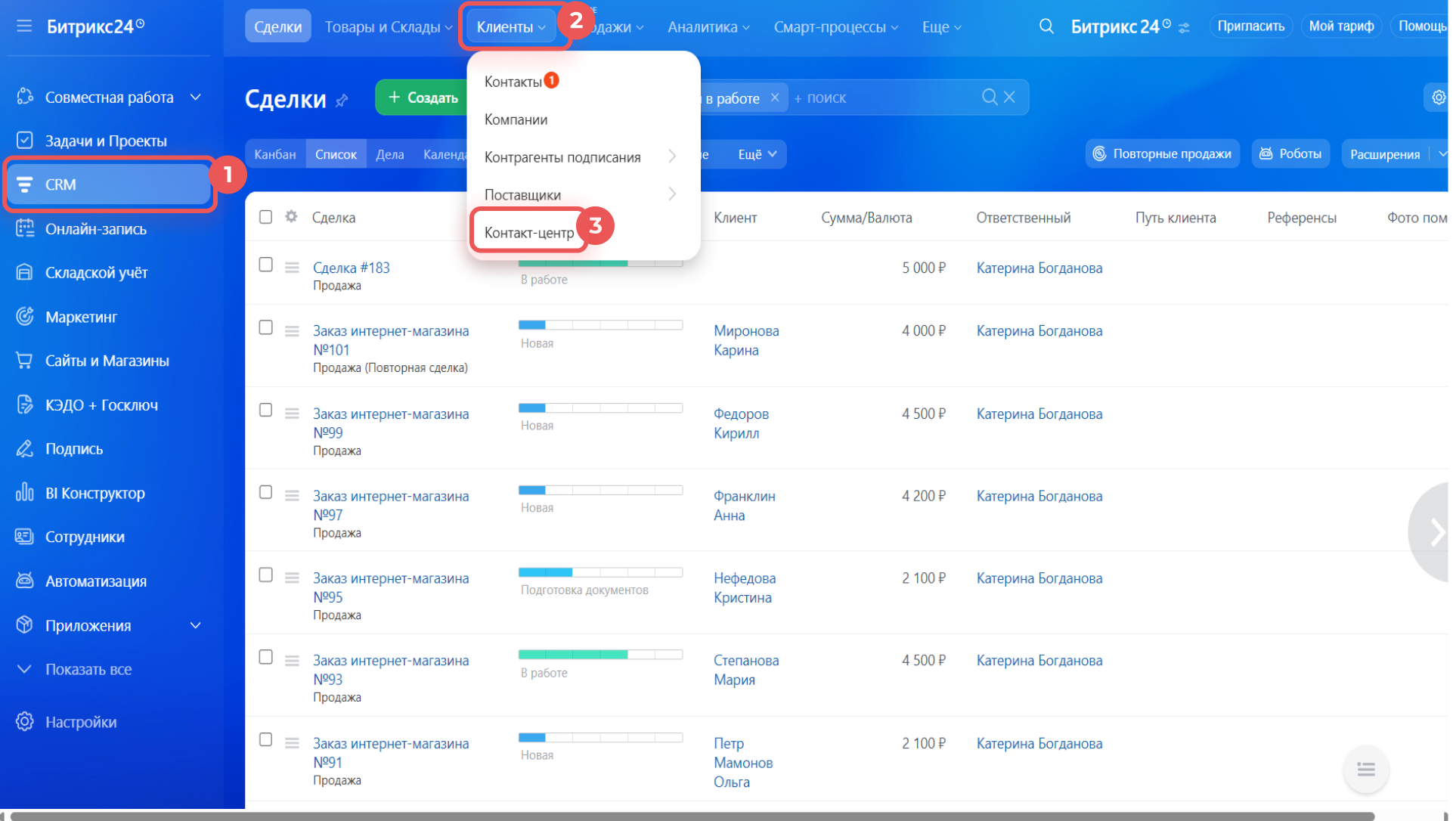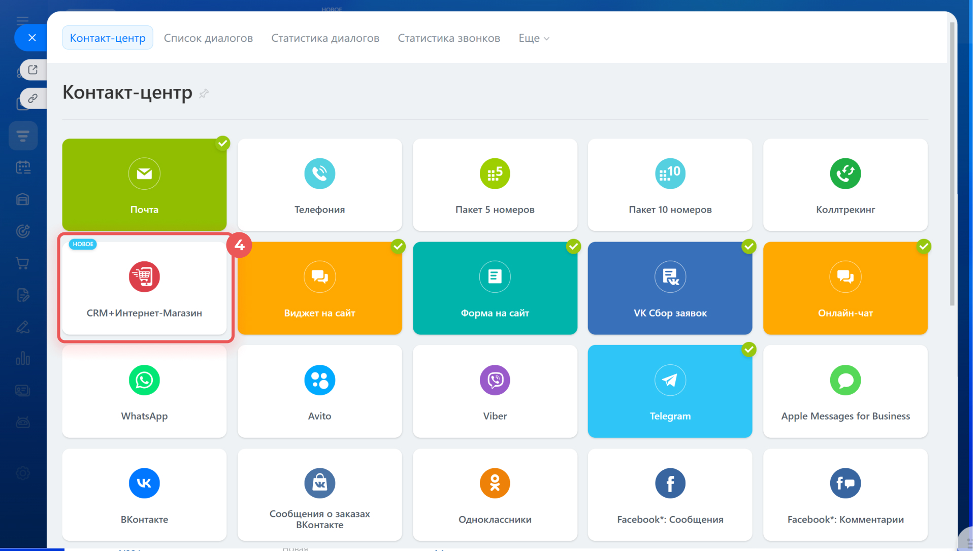 Перейдите в раздел CRM > Клиенты > Контакт-центр и кликните на иконку CRM + Интернет-магазин.