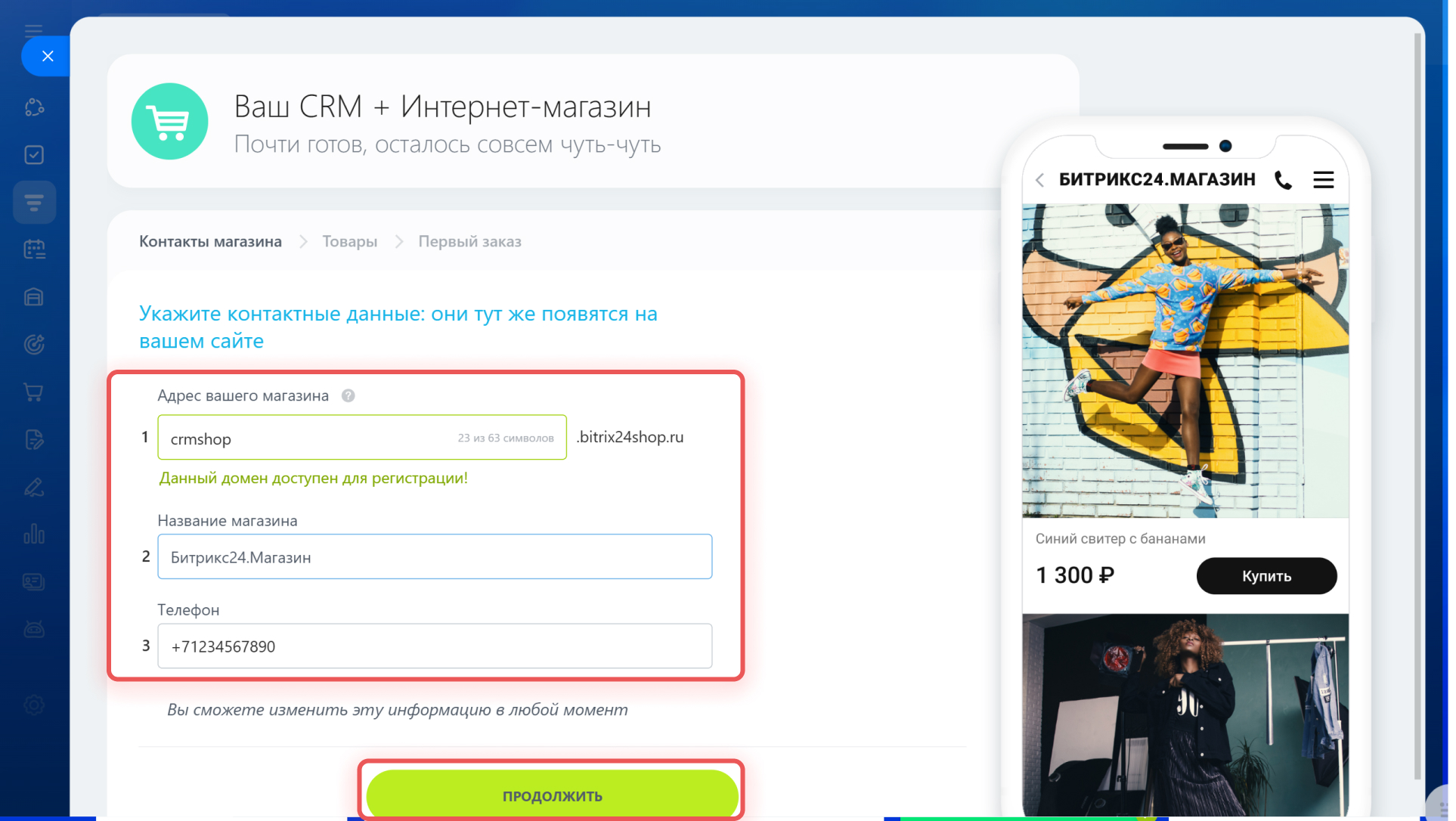 Эти данные можно изменить в любой момент после создания магазина. Подробности в статье Как указать контакты на сайте.