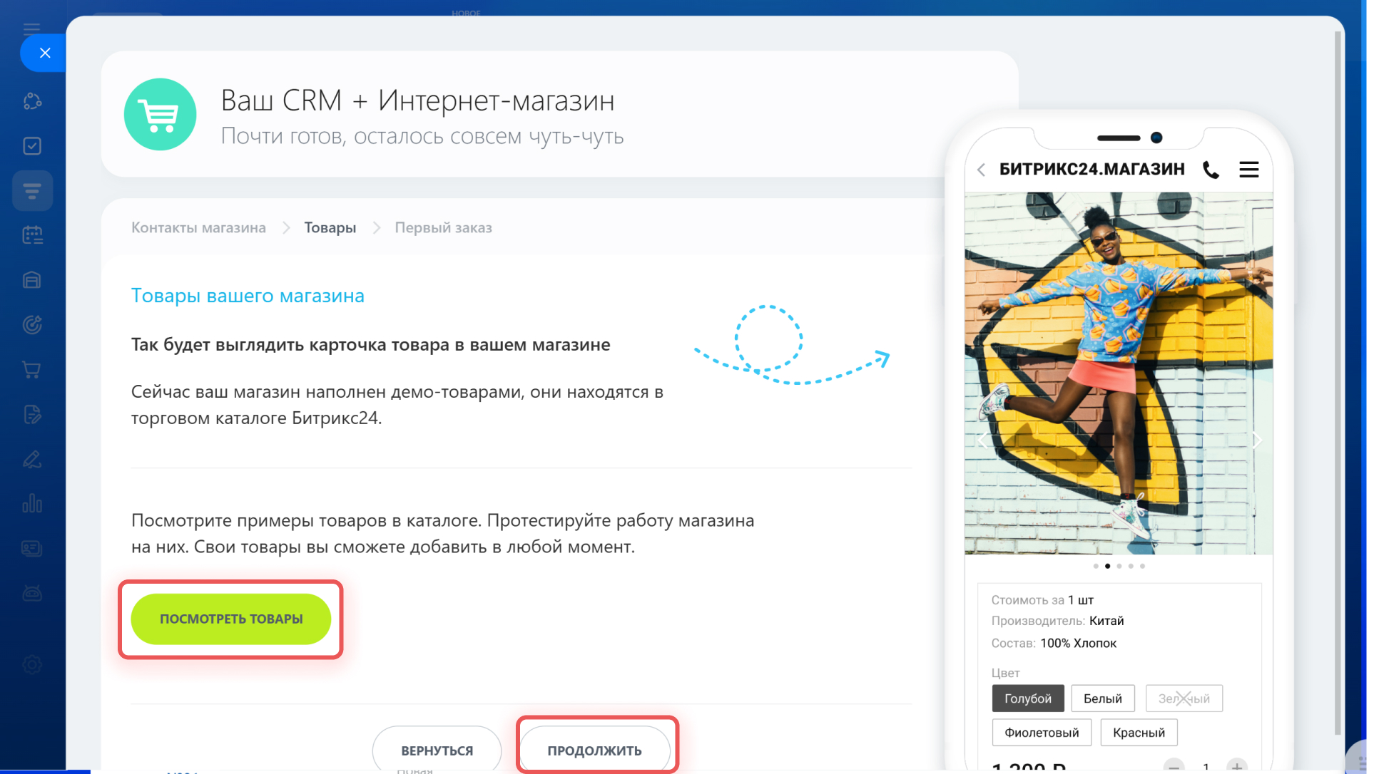 Магазин будет создан с демо-товарами. В дальнейшем вы сможете их удалить и загрузить свои. Чтобы посмотреть, как выглядят товары в каталоге, нажмите Посмотреть товары. После просмотра товаров, нажмите Продолжить.
