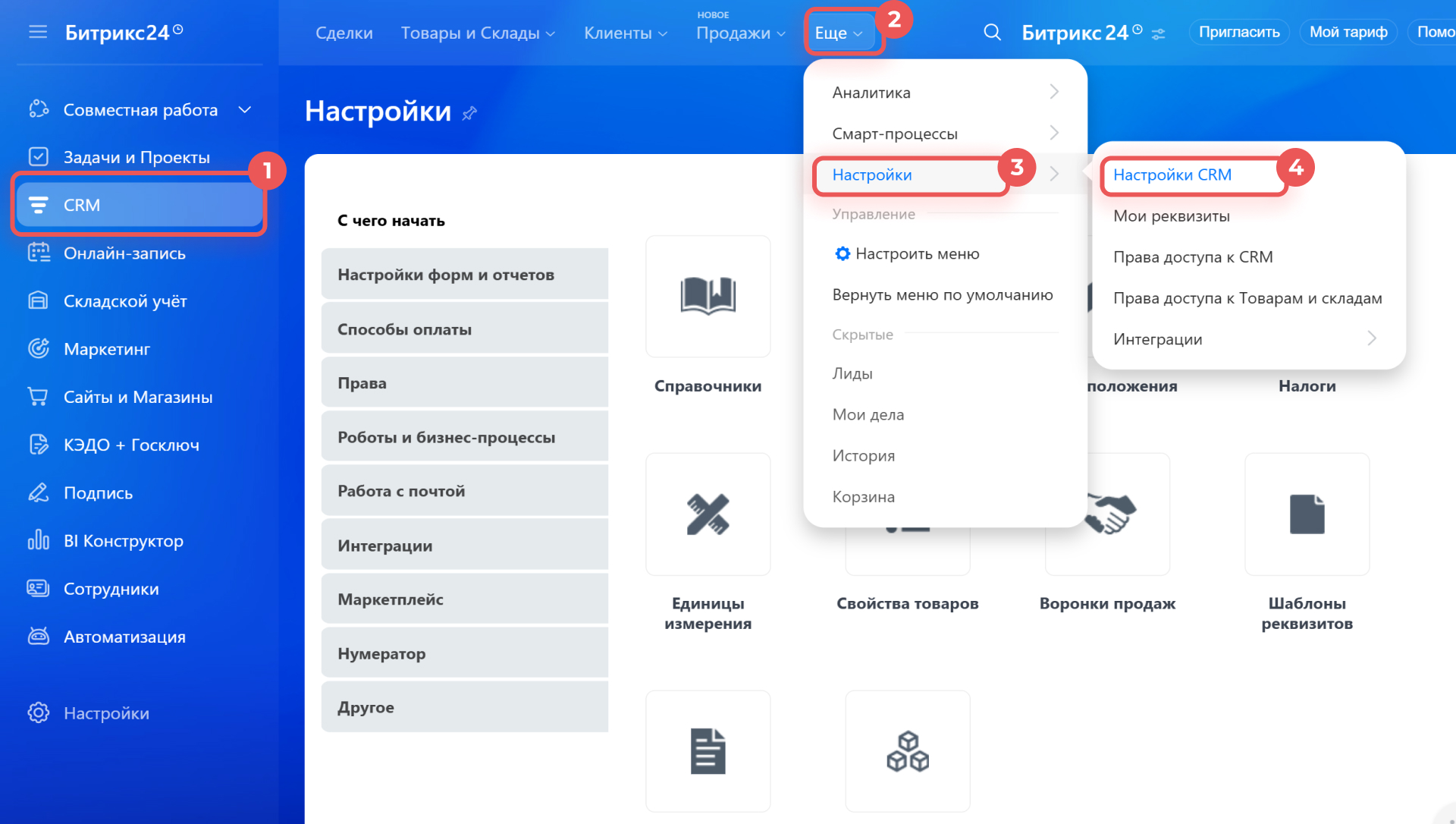 Перейдите в CRM > Еще >Настройки > Ваши реквизиты.