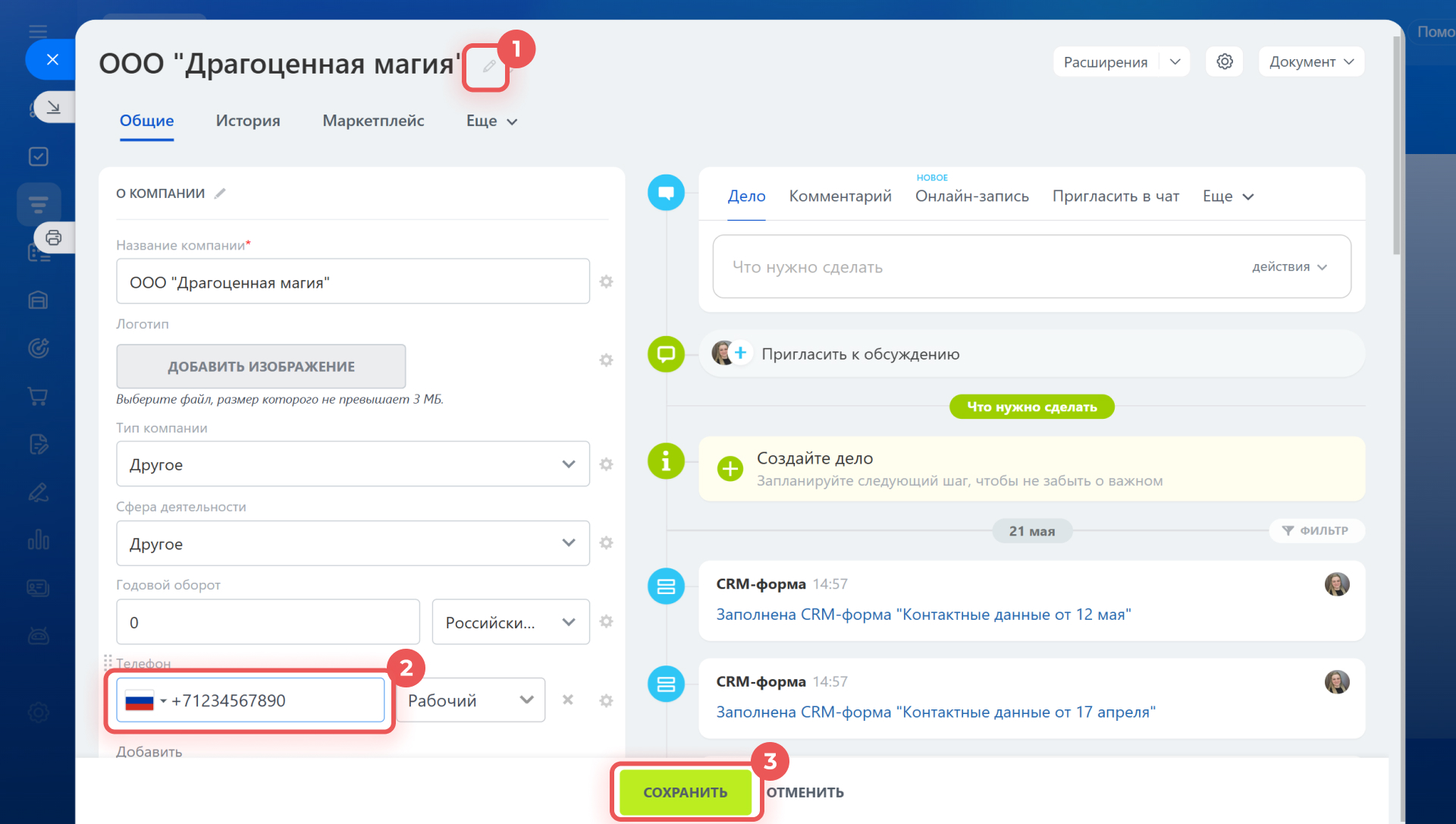 Откройте карточку и нажмите на карандаш рядом с названием. Отредактируйте номер телефона и сохраните изменения.