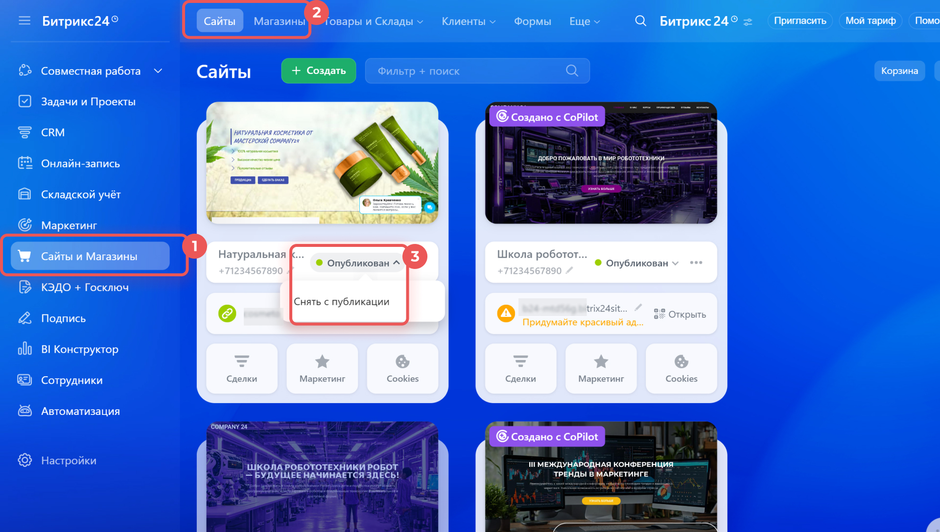 Перейдите в раздел Сайты и Магазины и выберите вкладку Сайты или Магазины. Нажмите на статус сайта, чтобы снять его с публикации и опубликуйте заново, чтобы изменения сохранились.