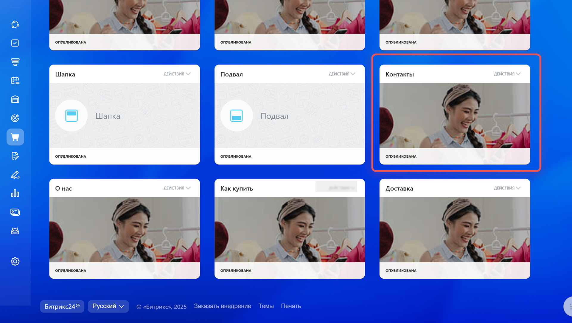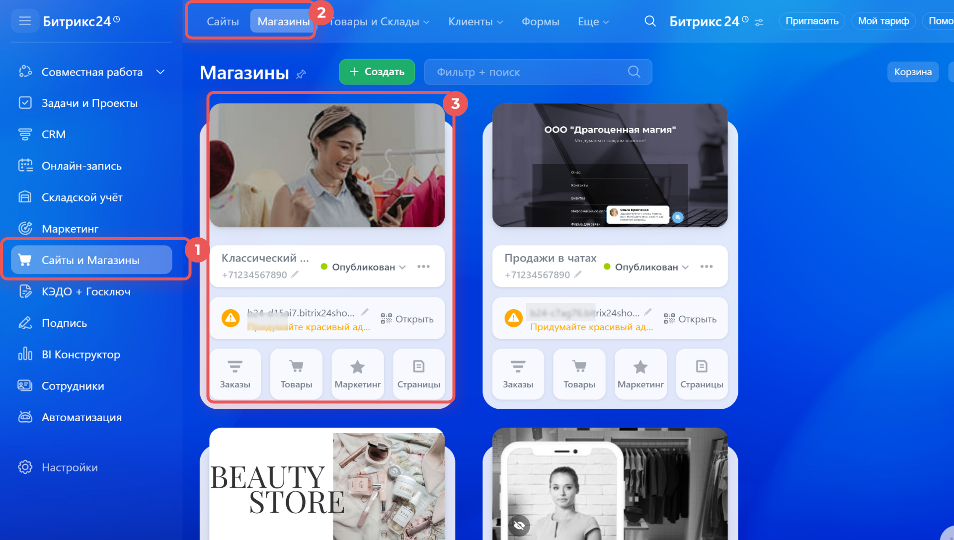 Перейдите в раздел Сайты и Магазины и выберите вкладку Сайты или Магазины. Откройте нужную страницу сайта, например, Контакты.
