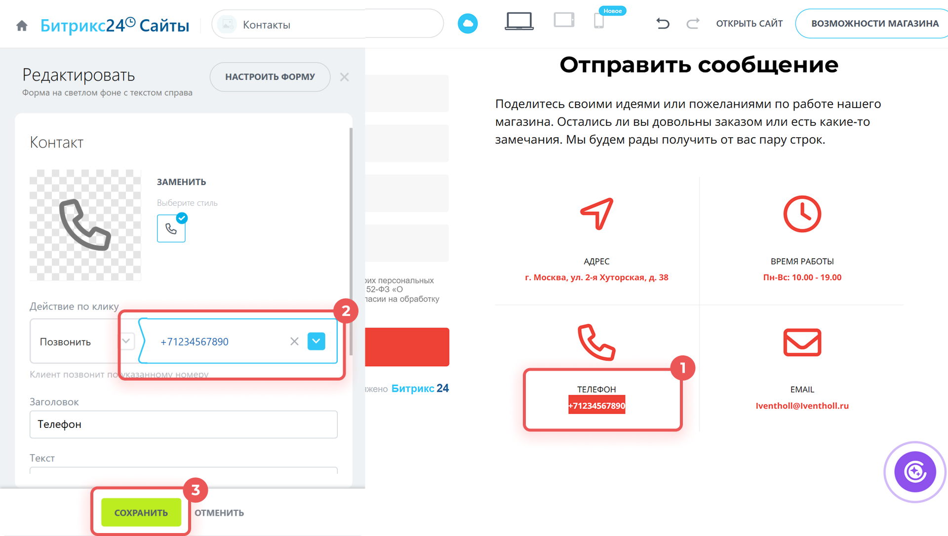 Возможность связаться с компанией повышает доверие клиентов. По умолчанию контактные данные расположены в шапке сайта и на странице Контакты. Изменить их можно двумя способами: