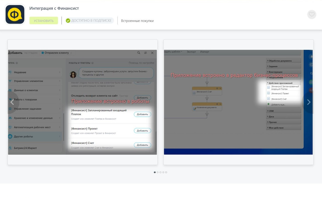 Приложение представляет собою конструктор интеграции между Битрикс24 и сервисом управленческой отчетности Финансист. Вы можете настроить взаимодействие используя роботы или бизнес-процессы по своему усмотрению.