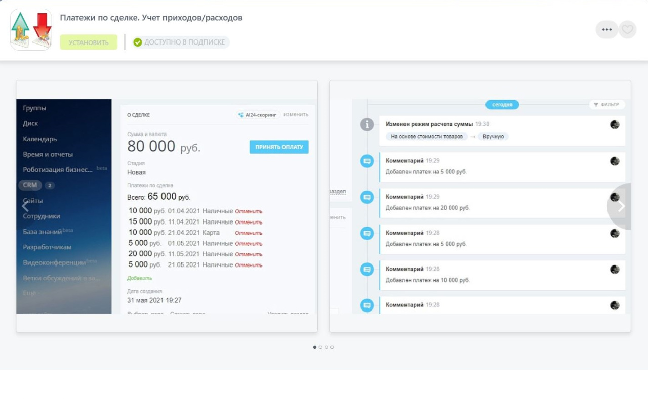 Приложение позволяет фиксировать несколько платежей по Сделке и видеть их в удобном виде непосредственно в карточке Сделки.