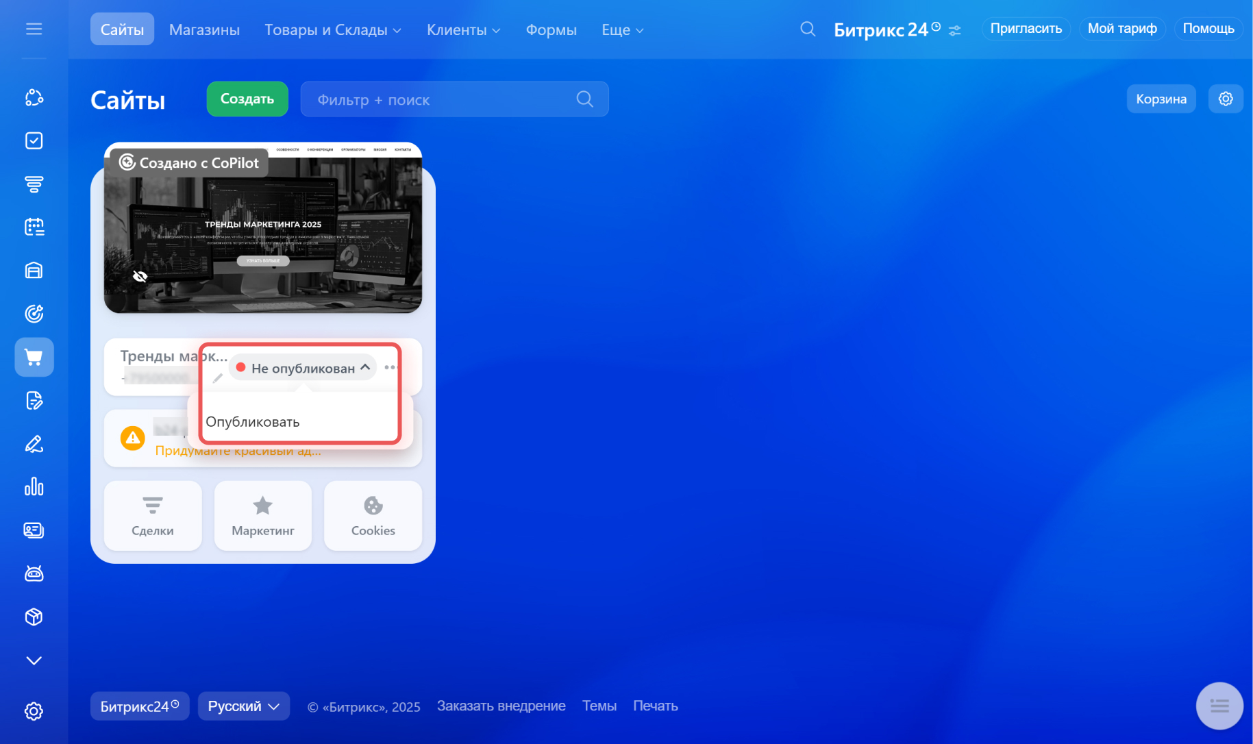 Когда вы редактируете сайт, изменения вносятся автоматически. Если правка не отображается, нажмите на значок рядом со статусом сайта, снимите его с публикации и опубликуйте заново.
