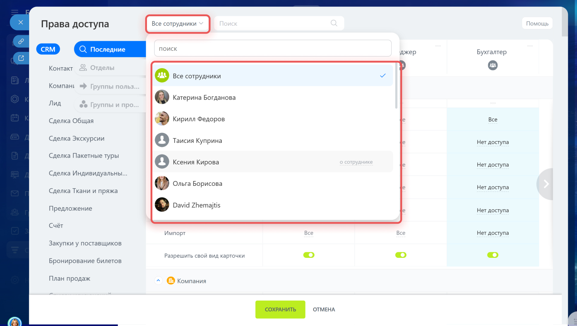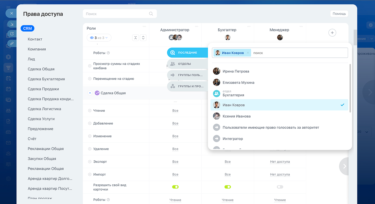 - Если с CRM работает небольшое количество сотрудников, настраивайте персональные права, а не групповые.