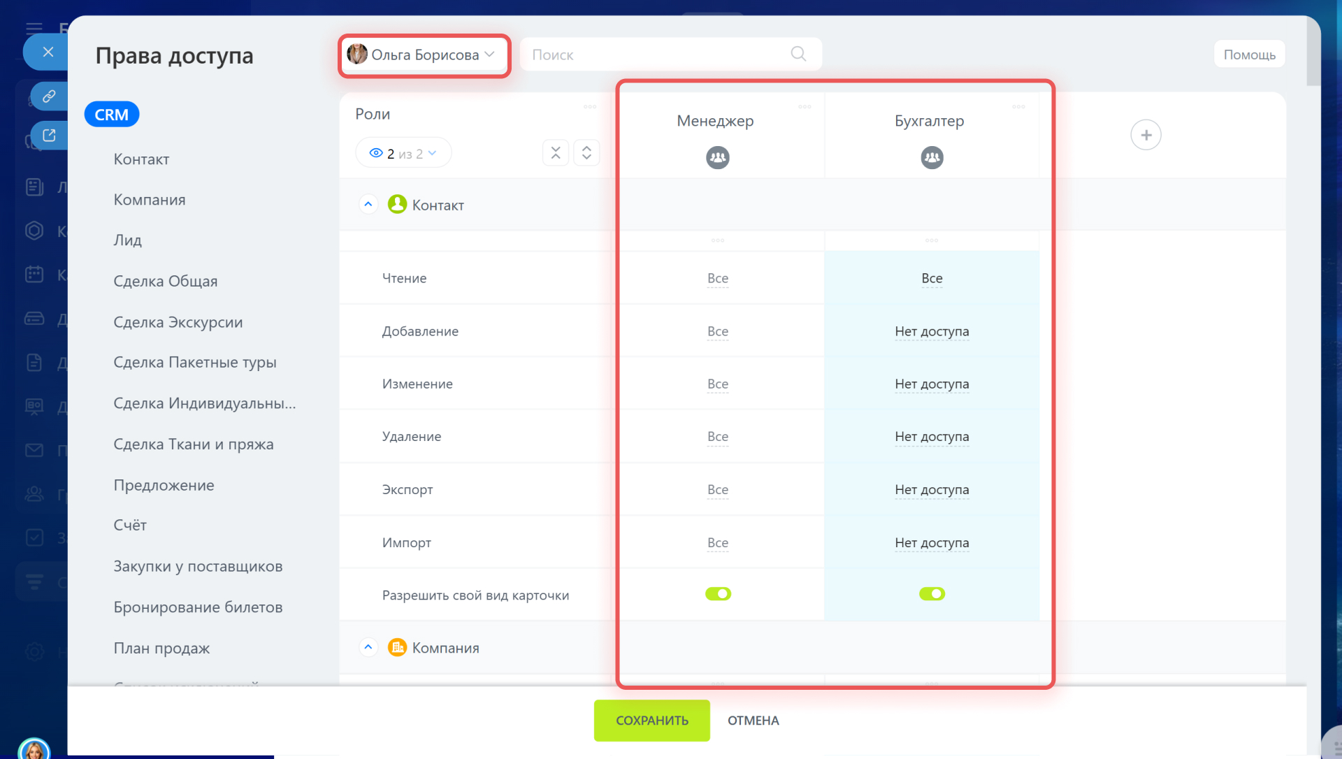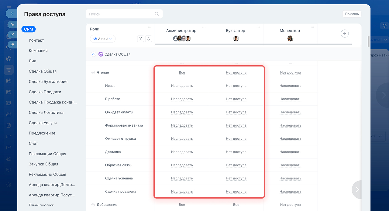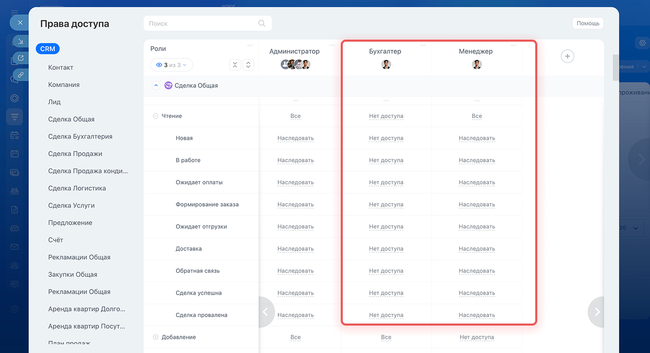 Рассмотрим пример: сотрудник состоит в двух отделах с разными правами доступа. У одного отдела доступ к сделкам закрыт, а у второго открыт. В первом случае права детализированные, а во втором наследуемые.