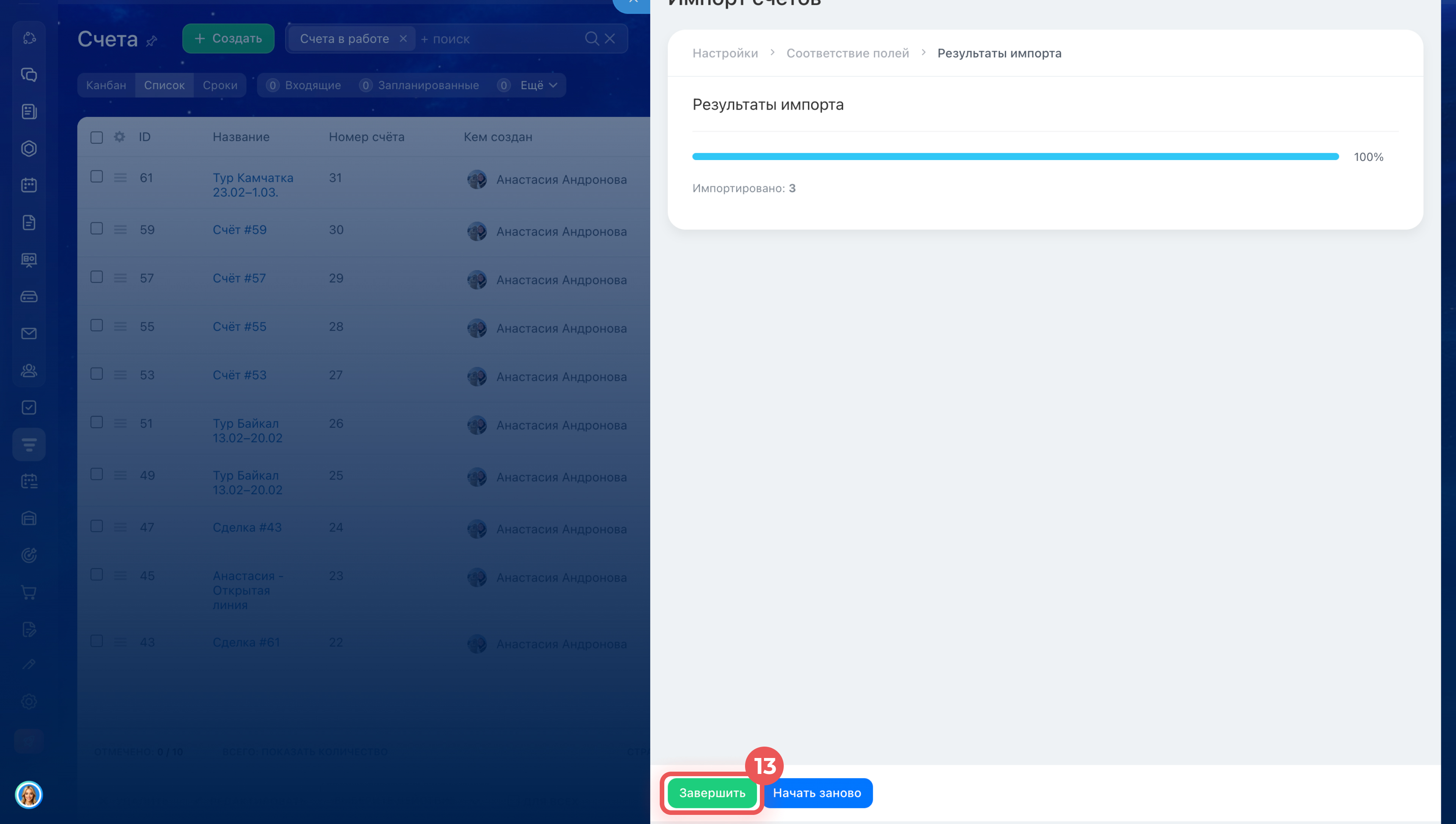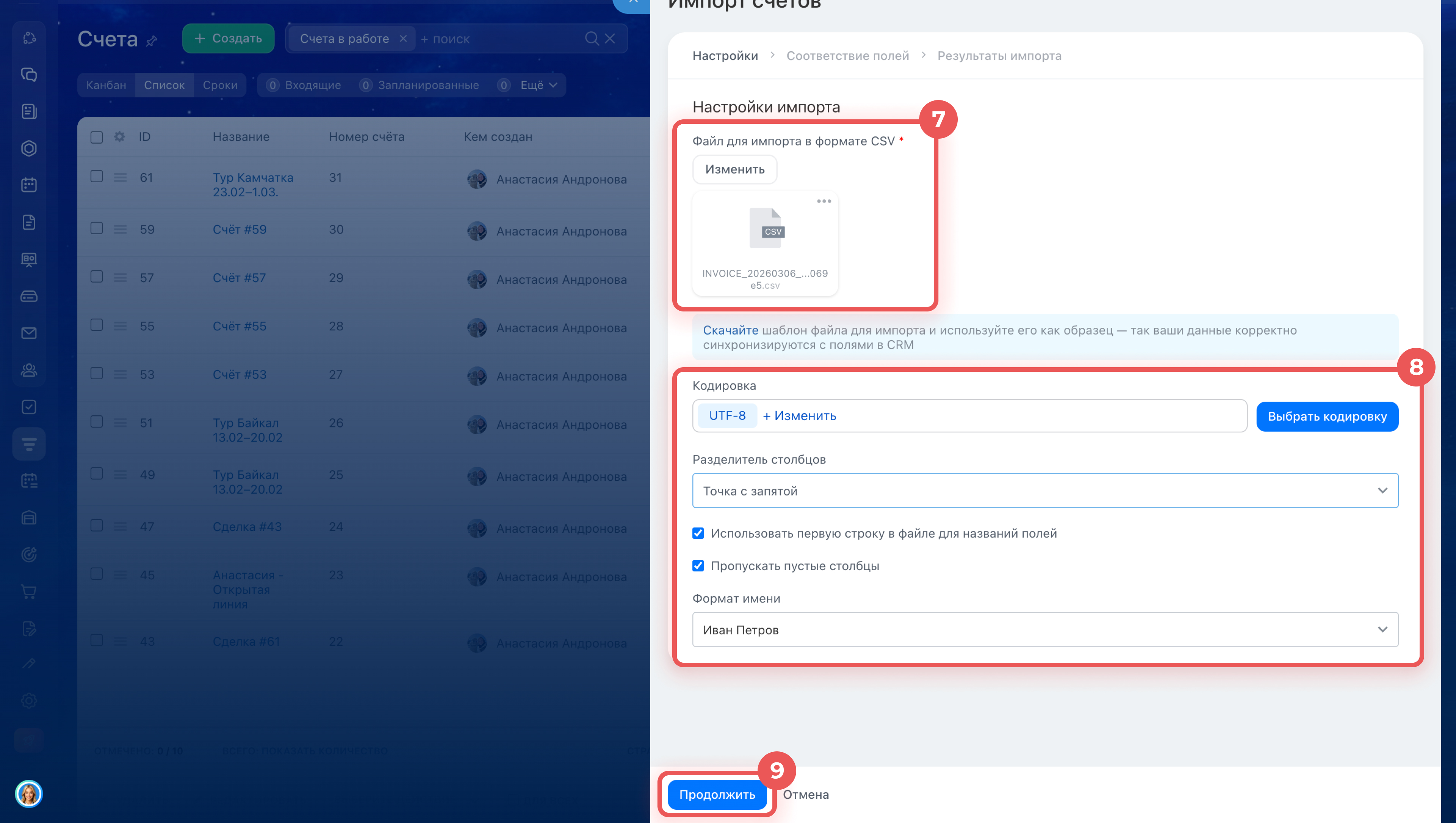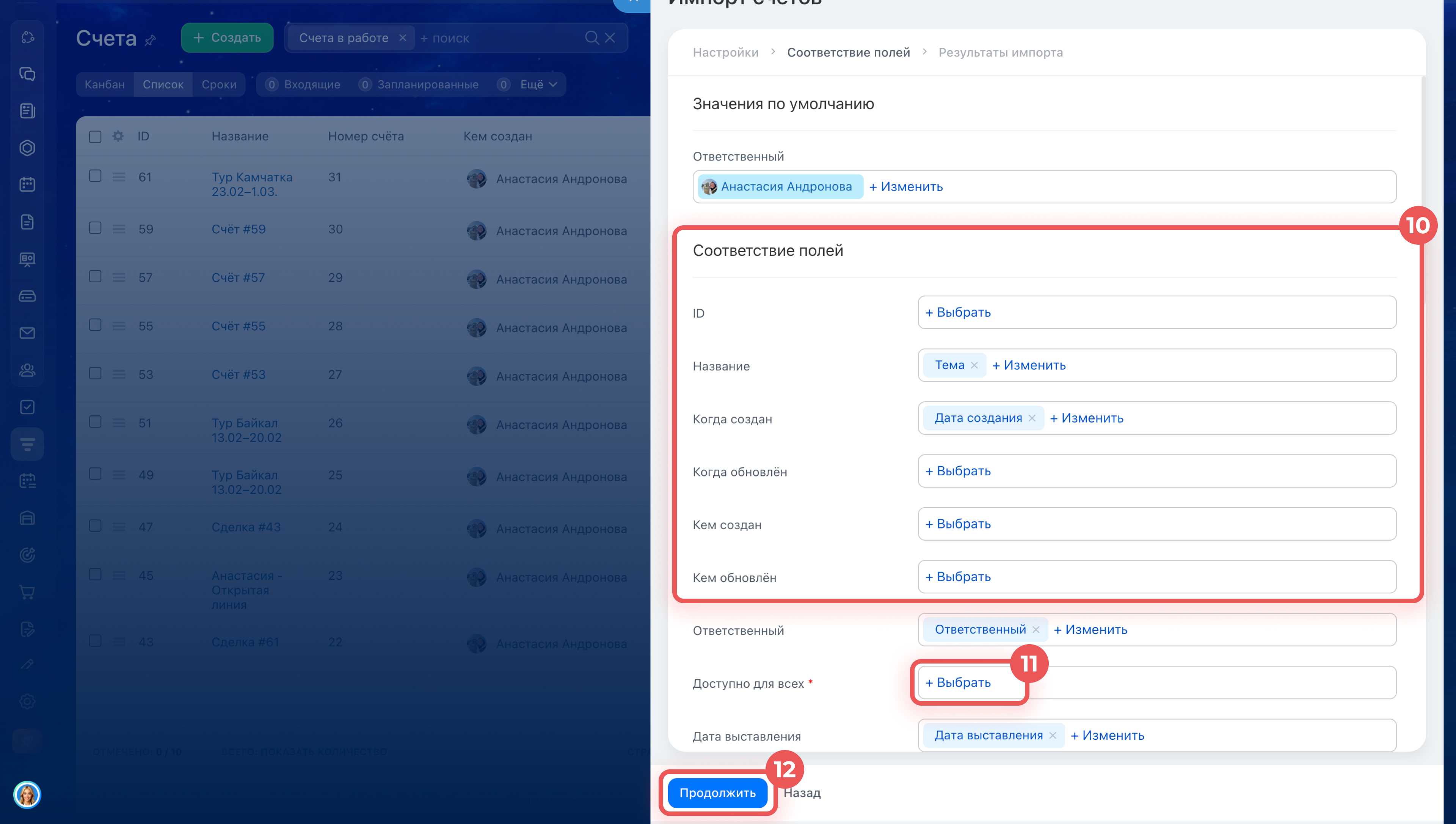 10. Проверьте, как Битрикс24 сопоставил данные из файла с полями новых счетов в CRM: