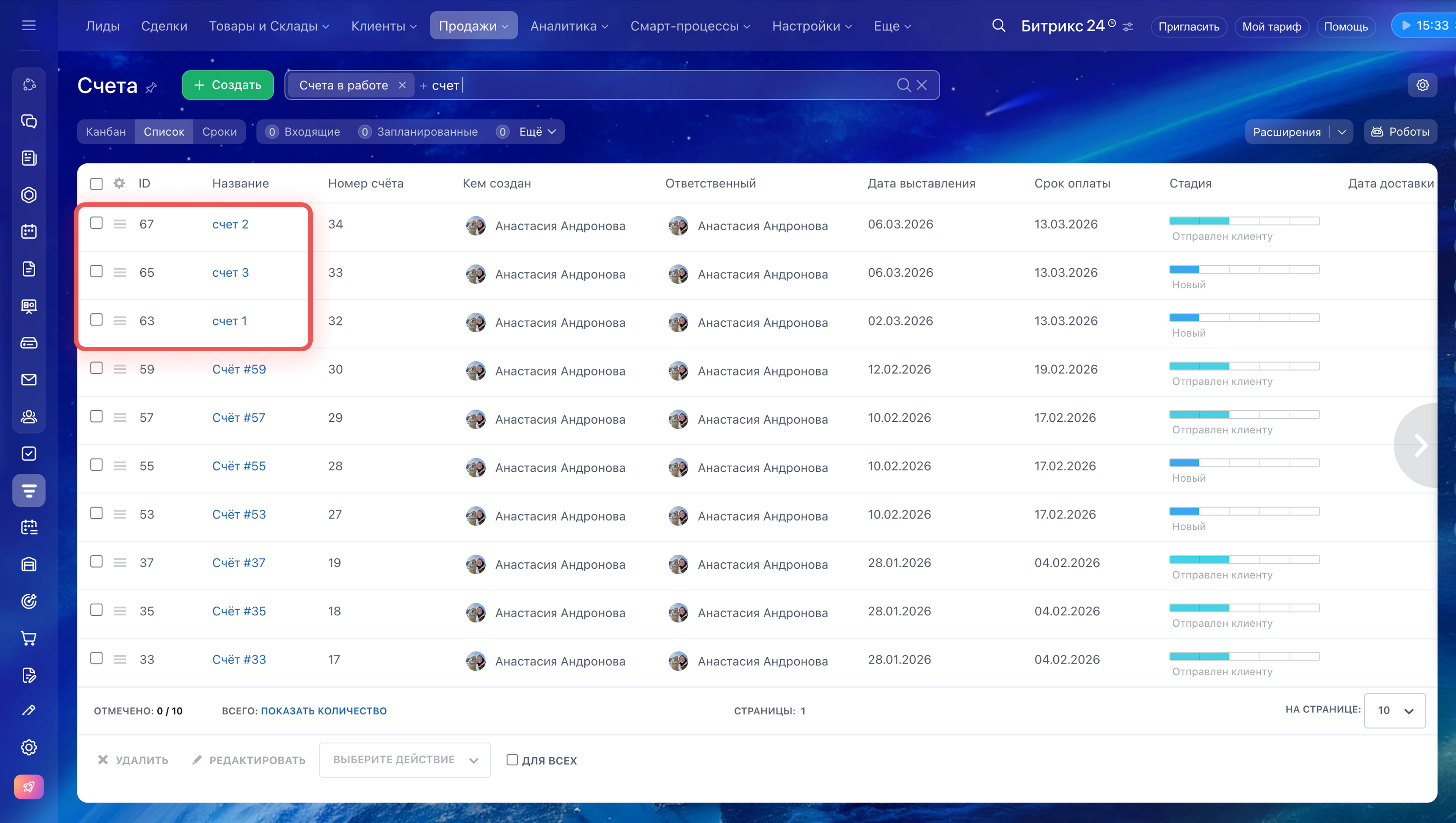После импорта счета появятся в списке новых счетов в разделе CRM > Продажи > Счета.