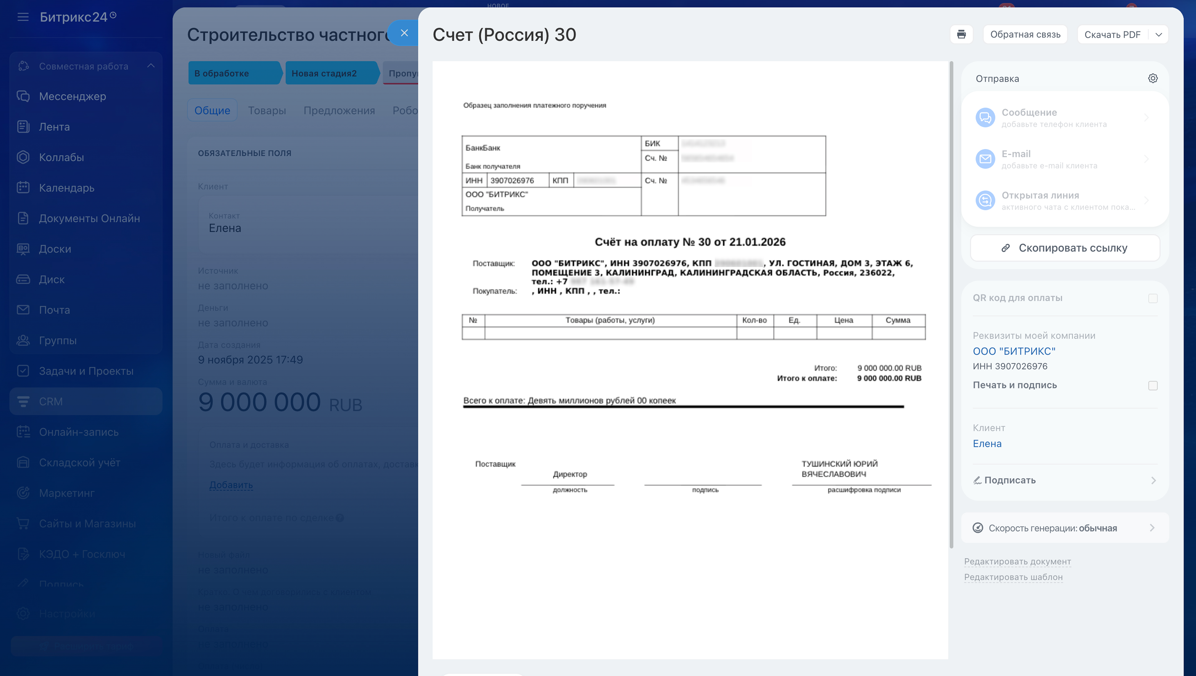 - слева отображаются поля нового счета в Битрикс24,