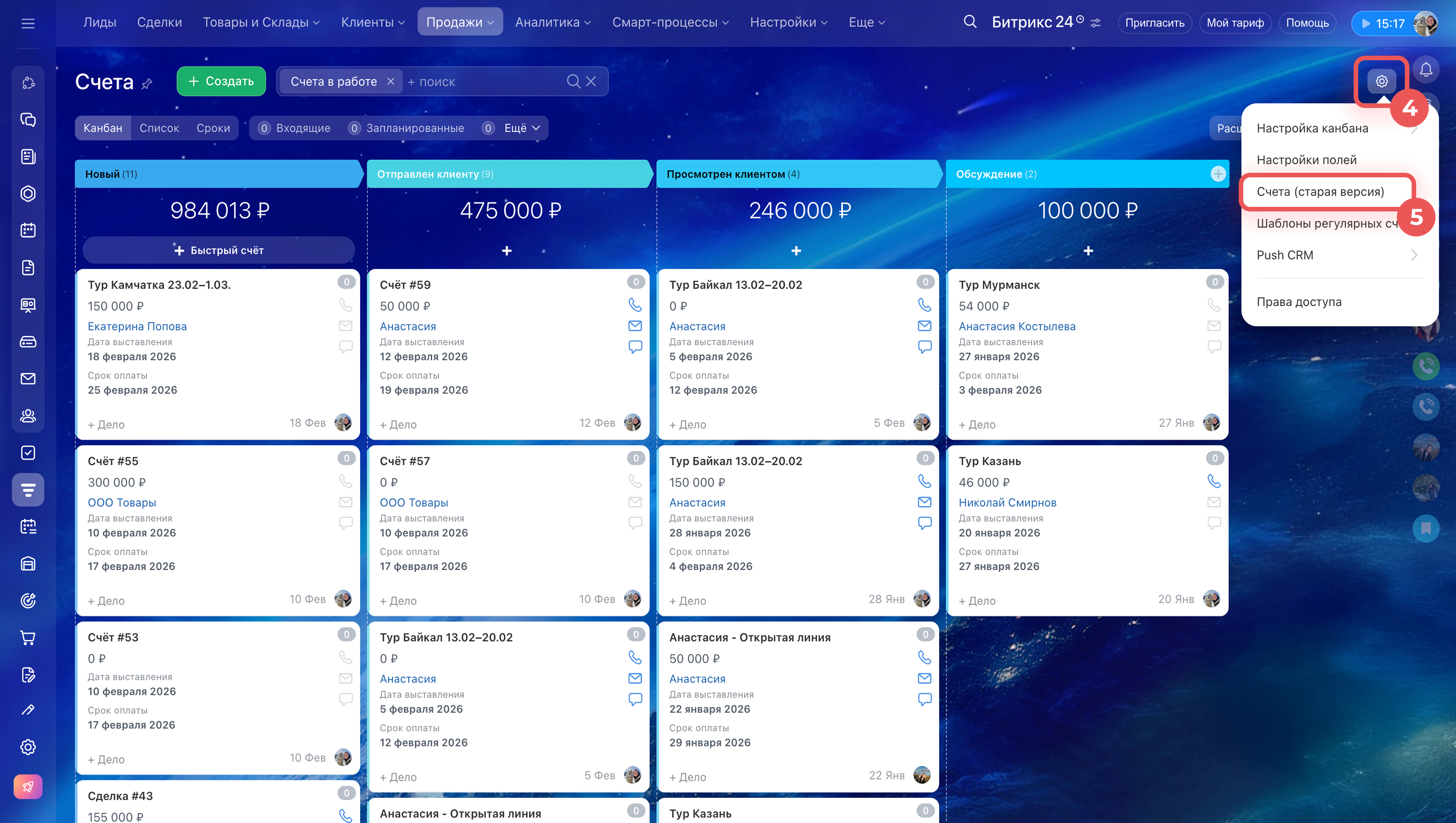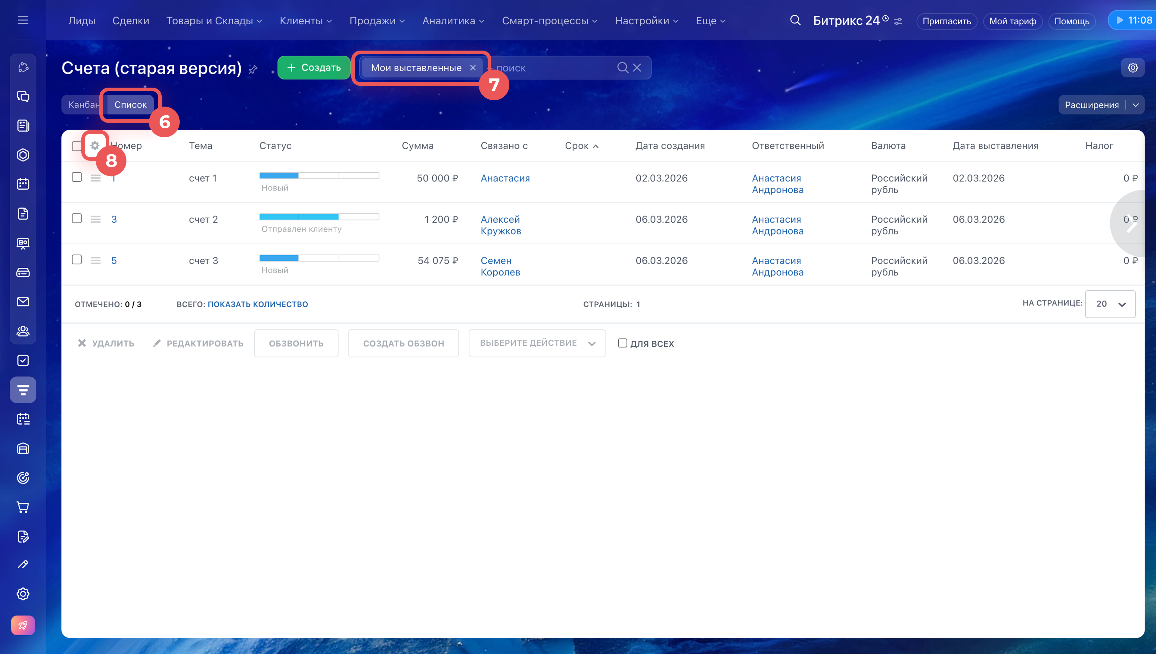 1–3. Перейдите в CRM > Продажи > Счета.