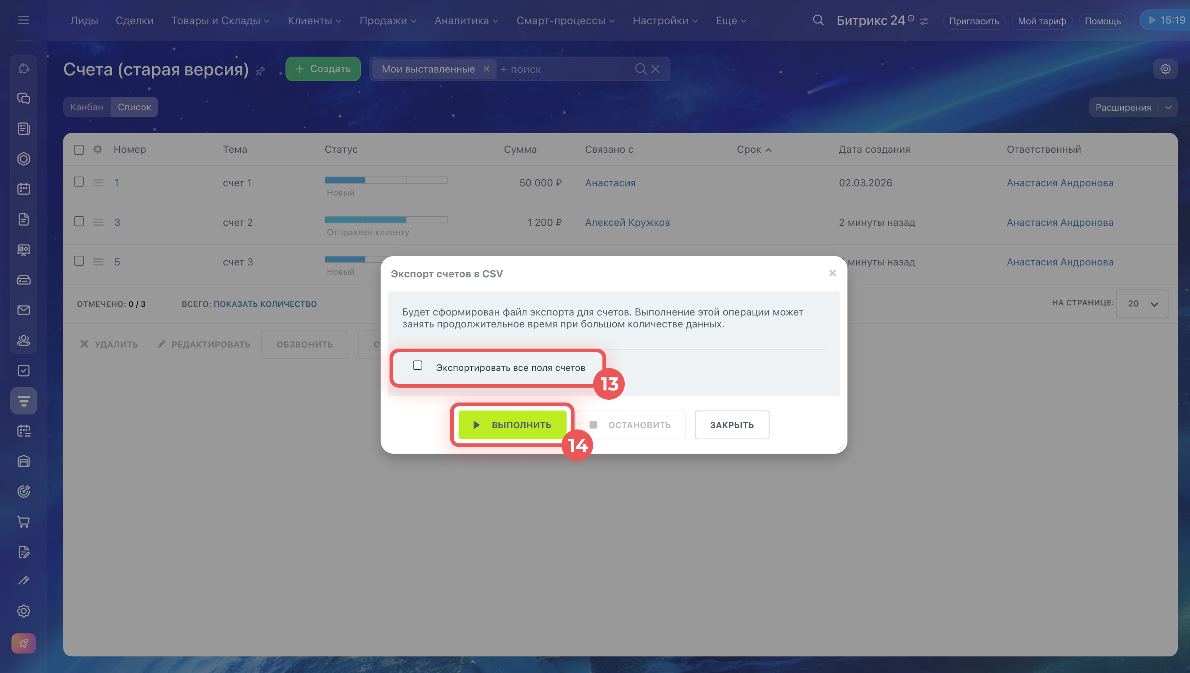 7. При необходимости настройте фильтр — например, по стадии или ответственному. Это удобно, если нужно экспортировать только часть счетов.