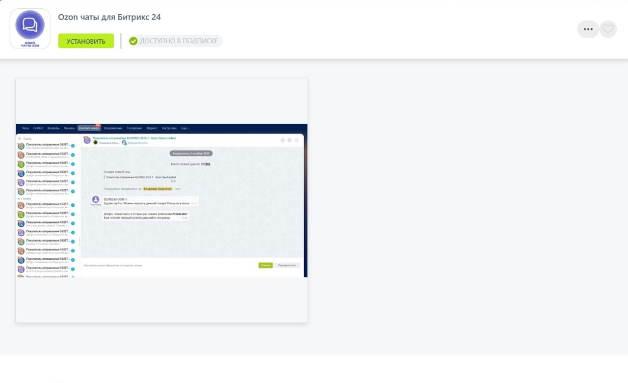 Модуль позволяет продавцам с подпиской Ozon Premium отвечать клиентам напрямую через чаты в Битрикс24 – без переключения между платформами.