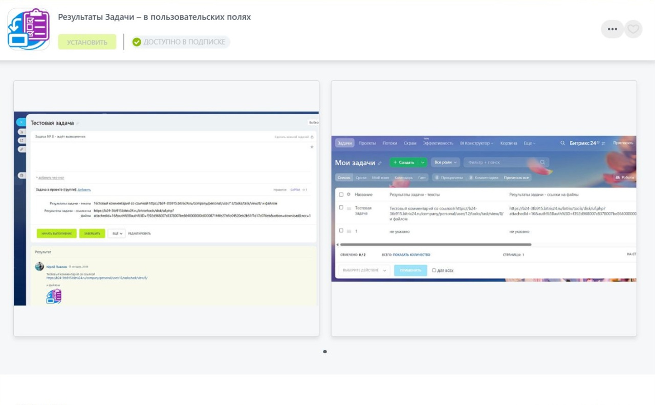 В режиме Список можно увидеть не все данные о Задачах. И, соответственно, нельзя экспортировать их, использовать в дашбордах. Это касается и комментариев, отмеченных как Результат. Приложение решает данную проблему, автоматически записывая результаты в 2 пользовательских поля – для текстов и ссылок на файлы.