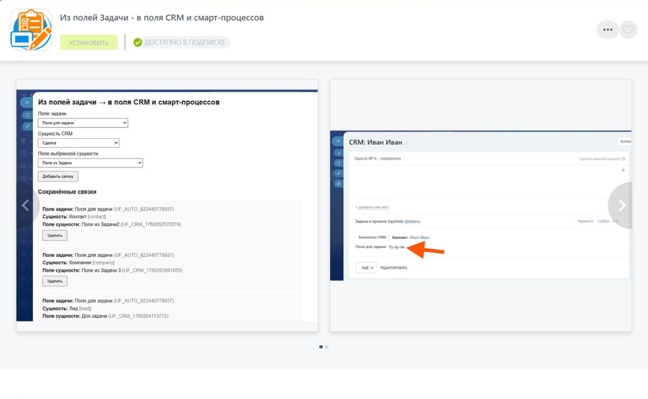 Установить приложение – Из полей Задачи – в поля CRM и смарт-процессов