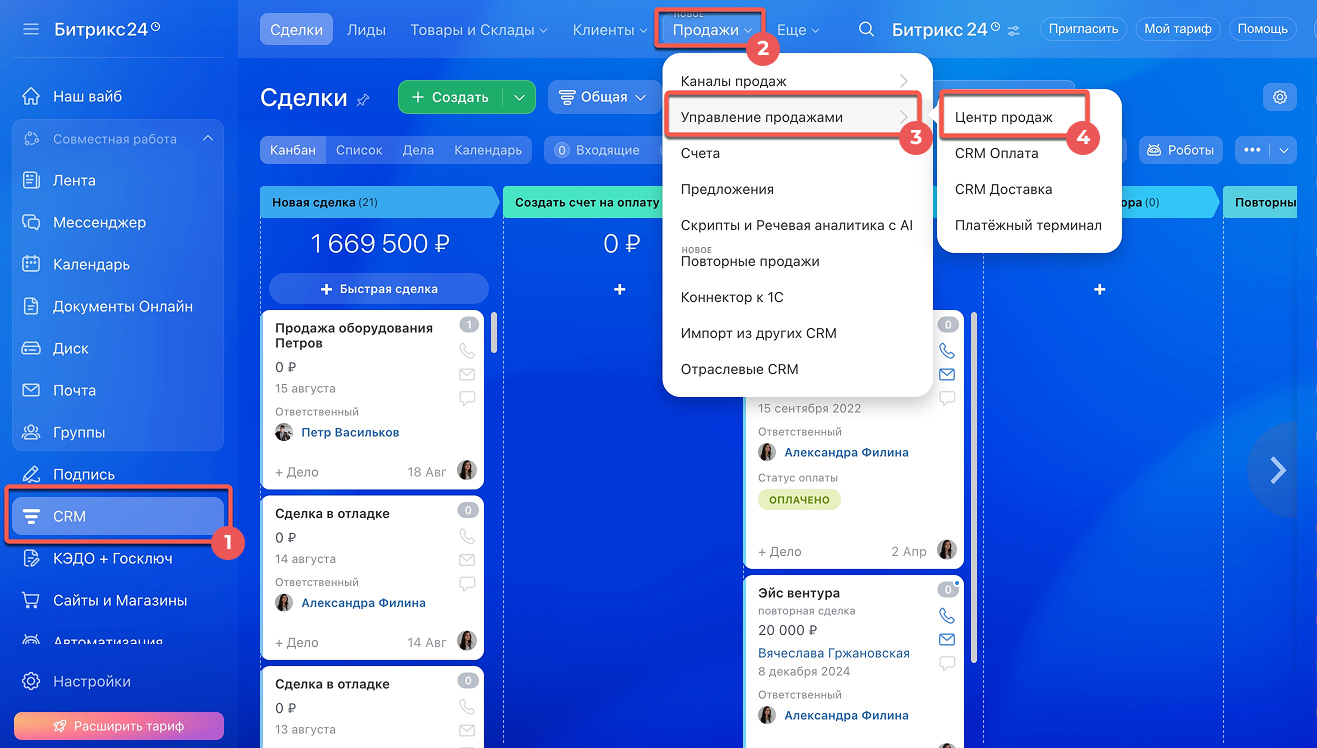 Перейдите в раздел CRM > Продажи > Управление продажами > Центр продаж.