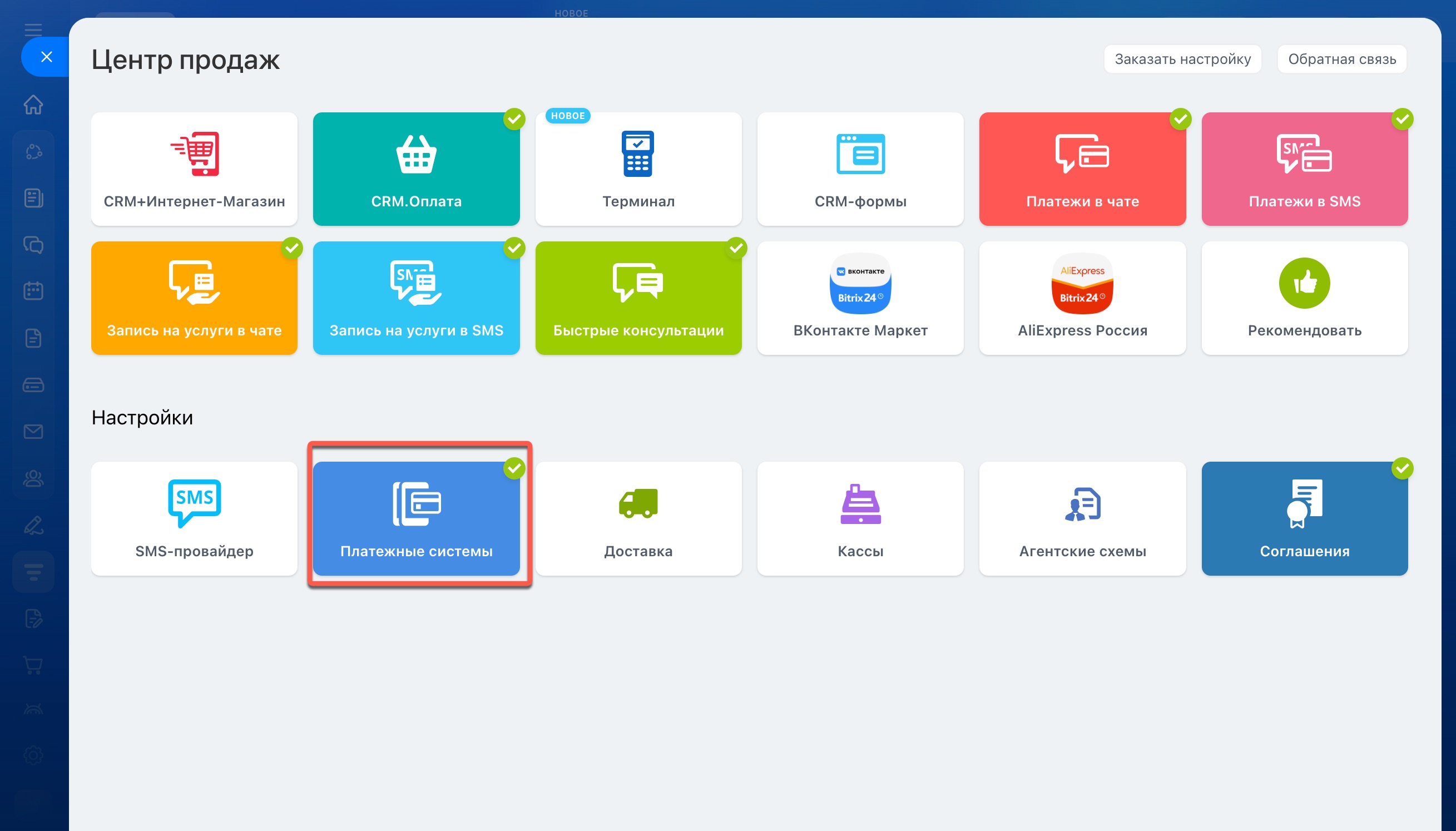 В разделе Настройки нажмите Платежные системы.