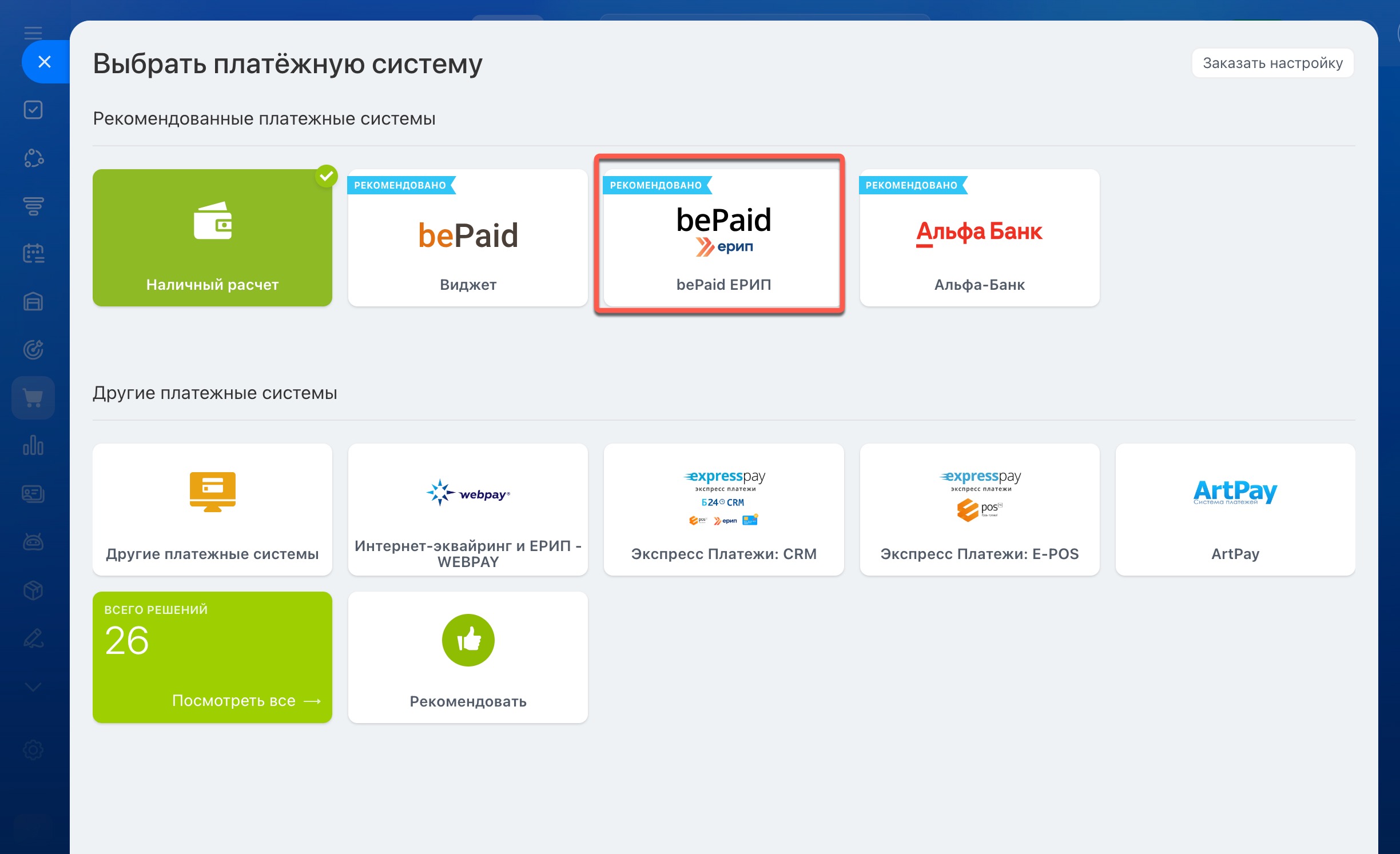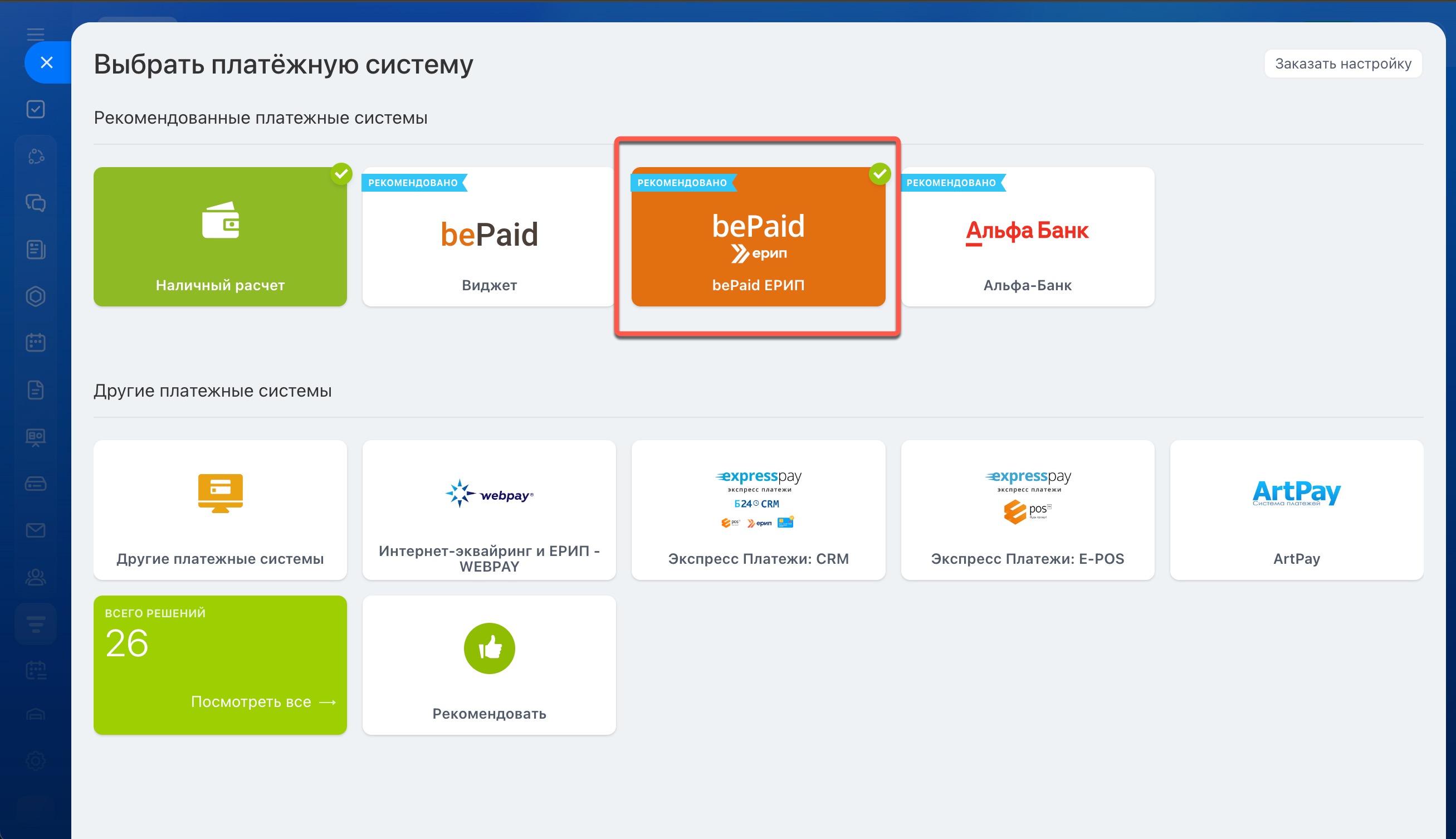 Выберите bePaid ЕРИП из списка рекомендованных платежных систем.